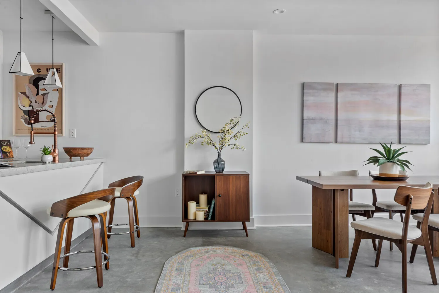 The kitchen and bathrooms are truly one-of-a-kind, featuring imported Italian copper-toned tiles and kitchen fixtures, paired with striking copper veined quartz countertops-a unique touch that elevates this home's modern aesthetic. The sleek, polished concrete floors throughout add a contemporary flair while offering easy maintenance.