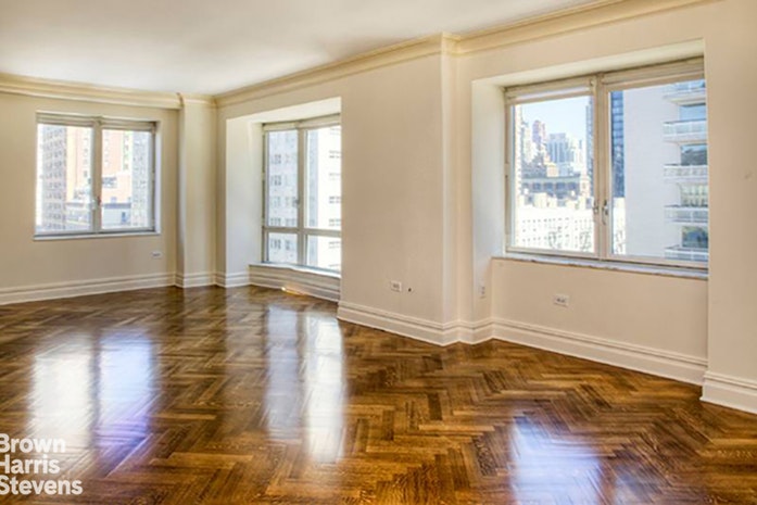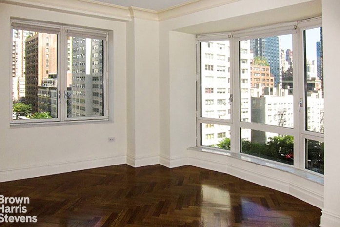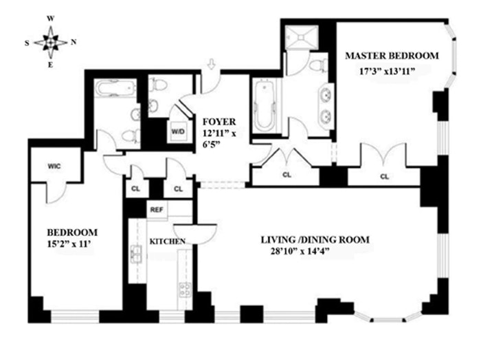This desirable two bedroom apartment with 2.5 baths is perfectly designed for both entertaining and private enjoyment. A large entry gallery with powder room leads into the light-filled 29 corner living room/dining room with bay window. The private master suite, also with bay window, offers large closets and ample marble bathroom with soaking tub, separate stall shower and double sinks. A separate hallway leads to the second bedroom with walk-in closet and en suite bathroom. The kitchen with east-facing window, is fully equipped and there is also a washer and dryer. All of the large-scale light-flooded rooms offer over-sized windows, high ceilings with crown moldings and central air conditioning.