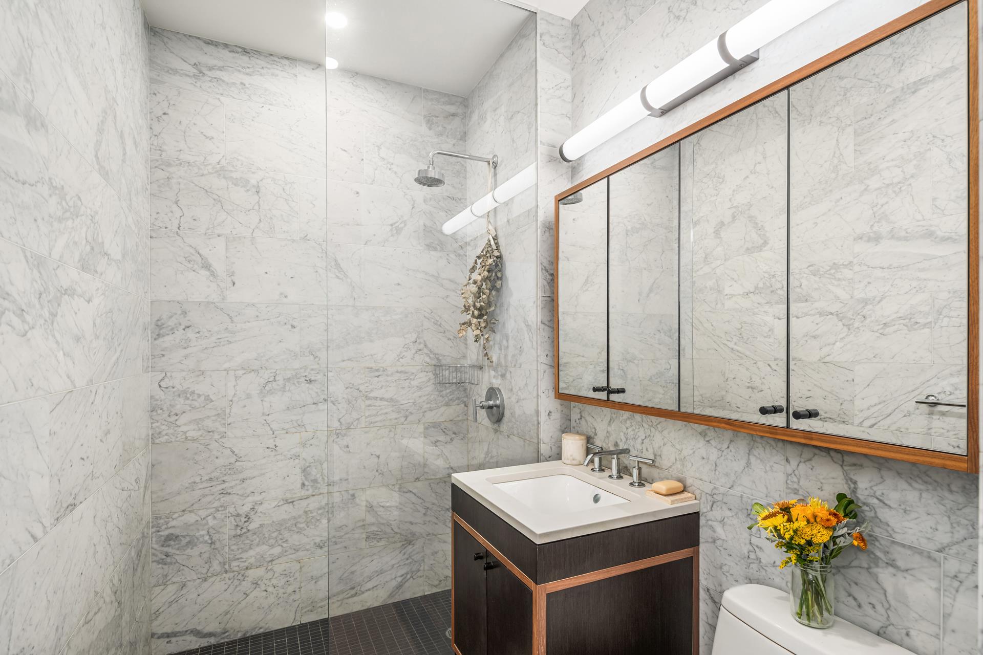 The bathroom features Pietre D'Italia mosaic floor tile, honed Carrara stone walls, Kohler fixtures and a walnut vanity with custom light pendants. The home also features custom window shades, tobacco smoked oak herringbone flooring and has an LG washer/dryer combo.