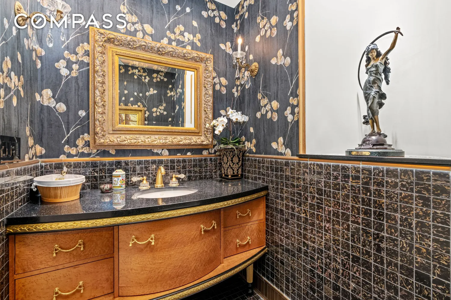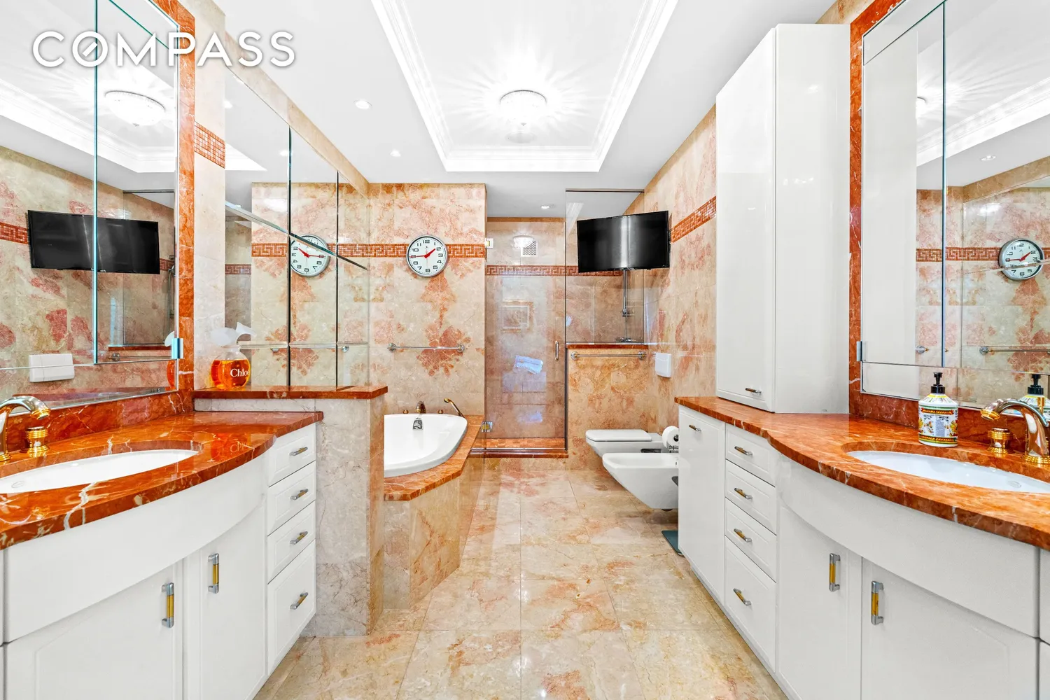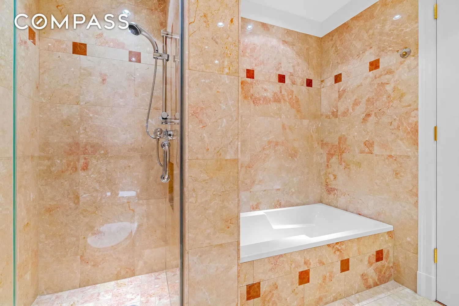The primary suite is a serene retreat with western exposures, a sunlit dressing room with custom cabinetry, and a luxurious marble bathroom featuring heated floors, a soaking tub for two, a steam rain shower with dual heads, and dual vanities. Thoughtfully designed, the owners sacrificed one full bedroom and bath to create the spectacular oversized walk-in closet/dressing room with stunning views of Lincoln Center. This space can easily convert back into an additional bedroom with a full bath if desired. Three additional bedrooms each feature en-suite marble baths and custom closets, and a windowed room serves perfectly as an in-home gym or office.