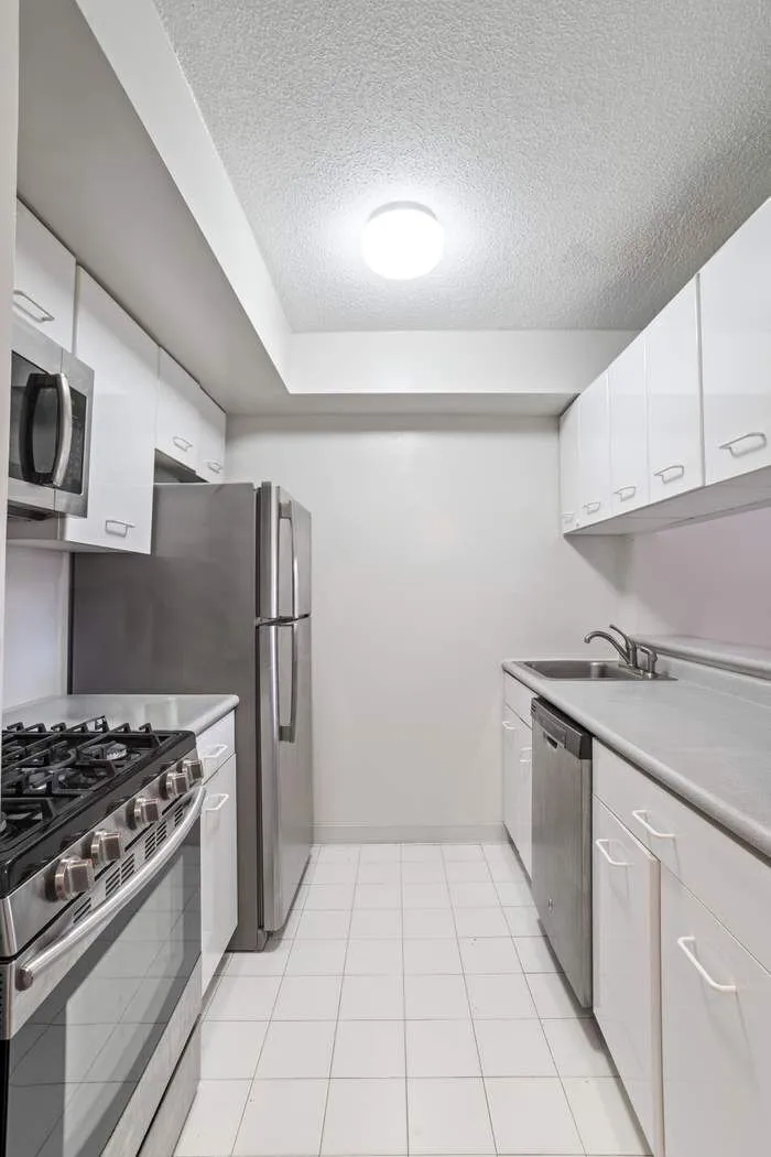 A spacious entryway welcomes you into the home and opens to a versatile dining alcove—perfectly suited for a dedicated dining area or a comfortable home office. The sleek galley kitchen features contemporary, full-sized appliances including a refrigerator, gas stove, microwave, and dishwasher, and is enhanced by an open breakfast bar ideal for morning coffee or casual meals.