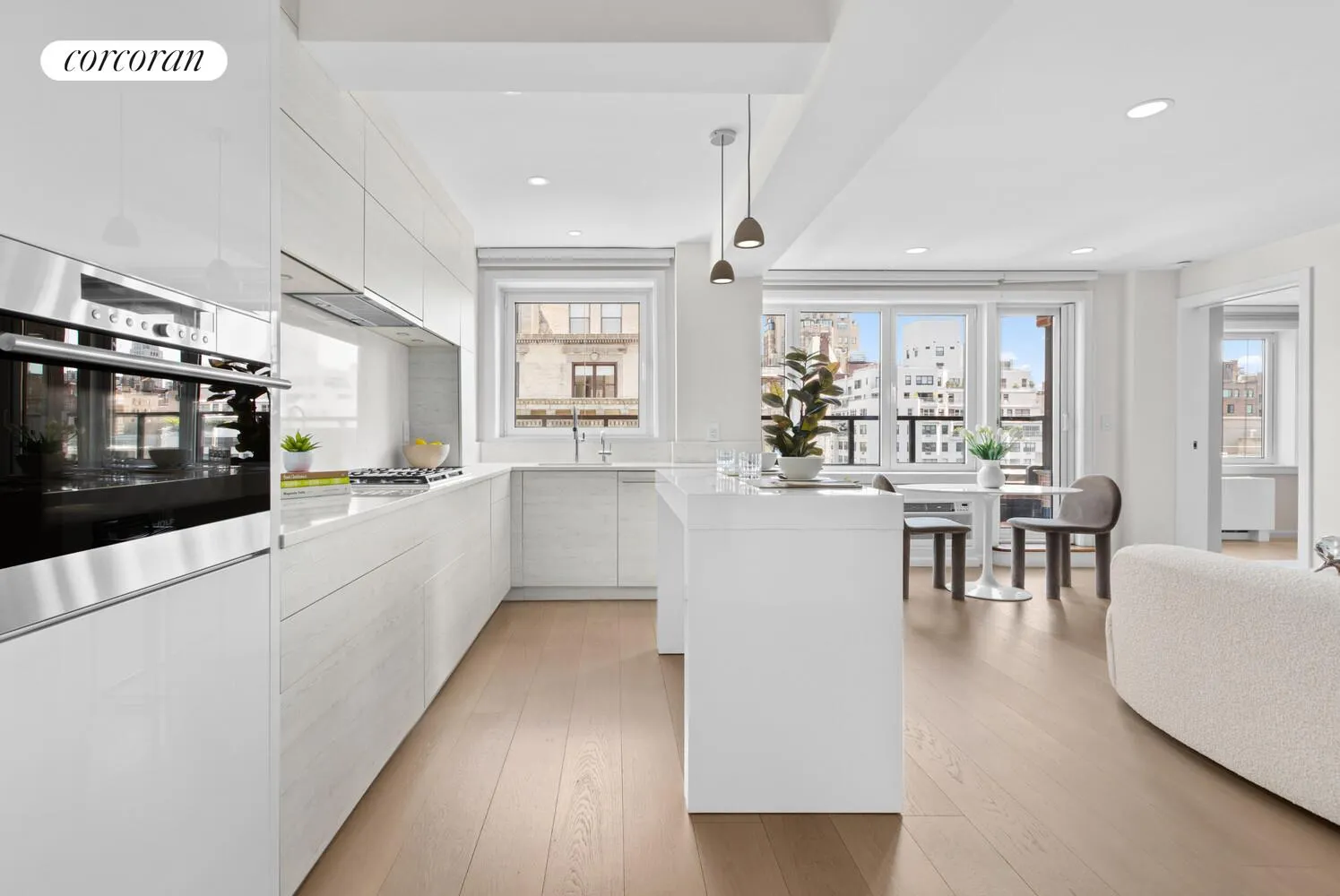 - A bespoke, minimalist, windowed European kitchen features white quartz countertops, a centered island, custom built in shelving, and top-of-the-line appliances including: Miele dishwasher, Sub-Zero refrigerator/ freezer, Wolf stovetop and steam oven, Miele ventilation hood, Vigo sink with integrated hot/cold water filtration system.