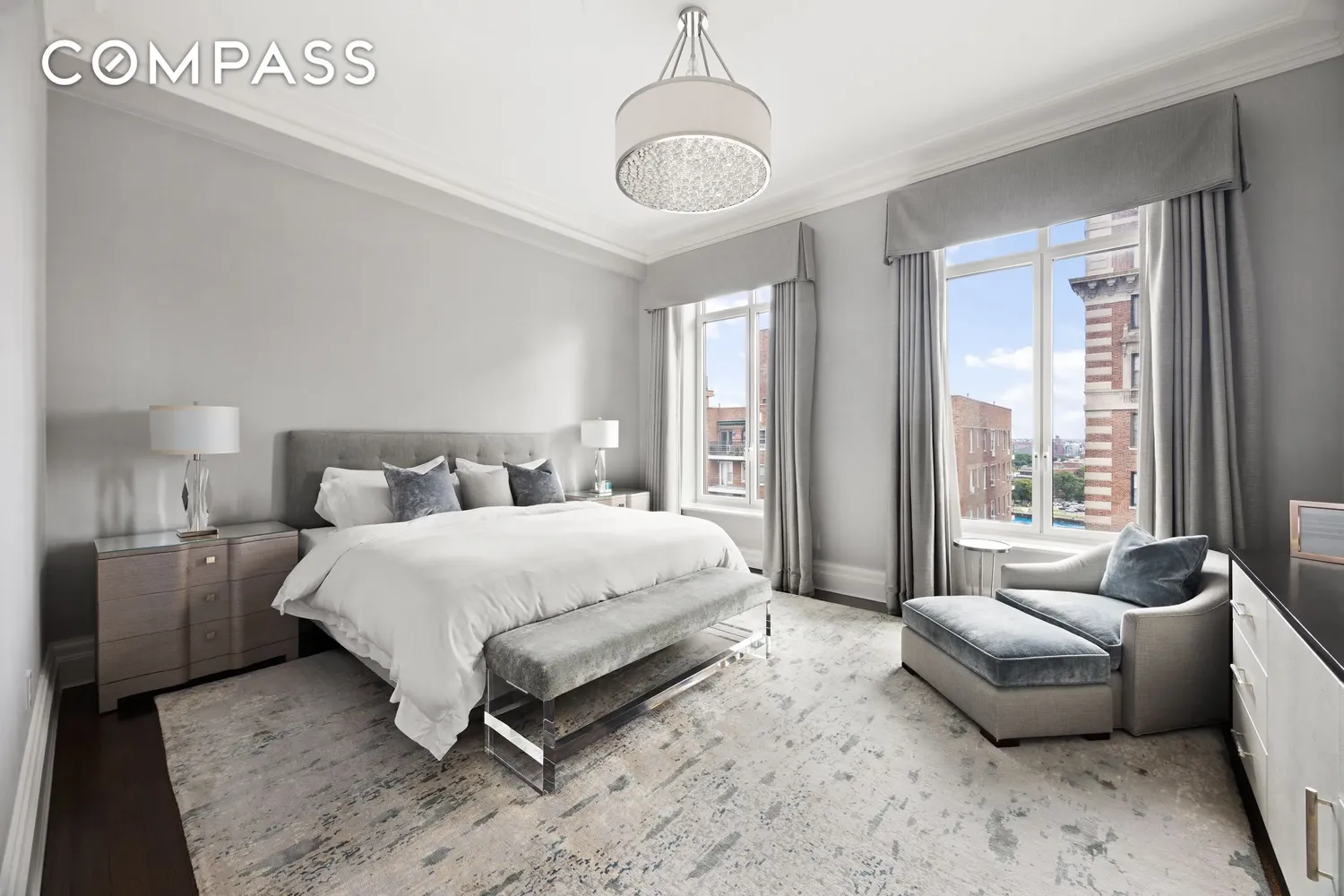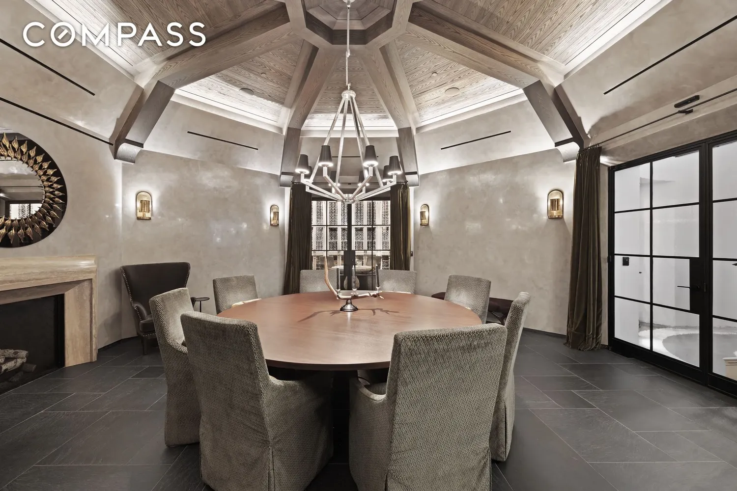 A semi-private elevator landing opens to a gracious entry gallery with powder room. The nearly 30-foot great room boasts a stunning bay window framing river views, while the adjacent formal dining room was opened up by the current owners to maximize light and flow between both rooms.