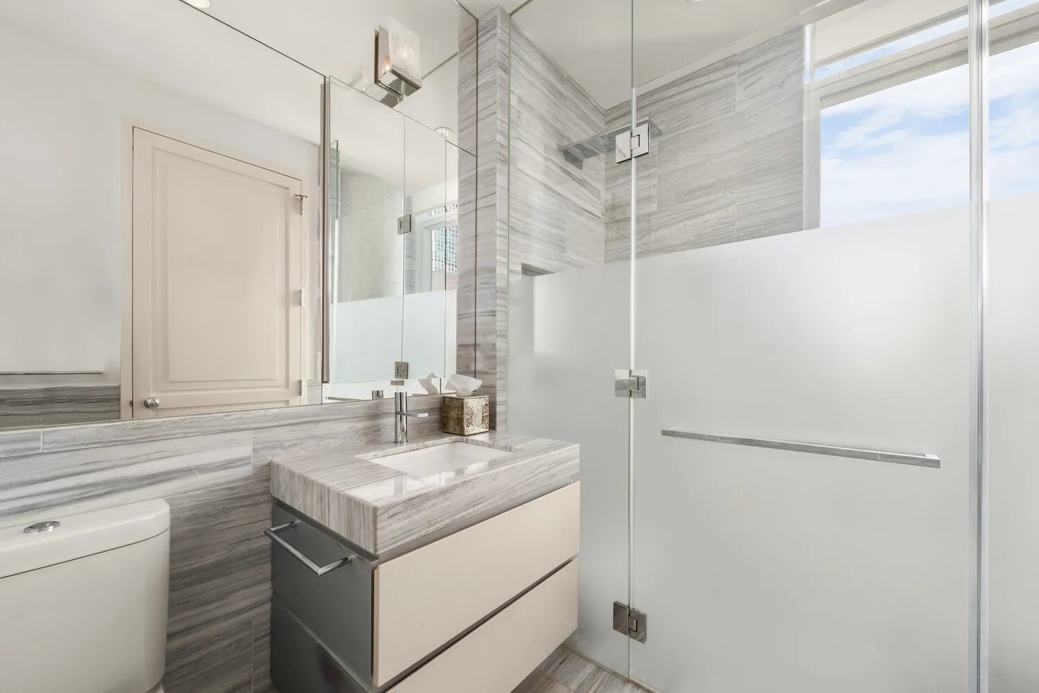 The luxurious primary bathroom is an oasis, appointed with honed Lido white marble, radiant-heated floors, a freestanding soaking tub, and a distinctive glass panel separating the powder and shower areas. All bathrooms and the powder room are wrapped in floor-to-ceiling Lido marble, creating a seamless and opulent aesthetic throughout.