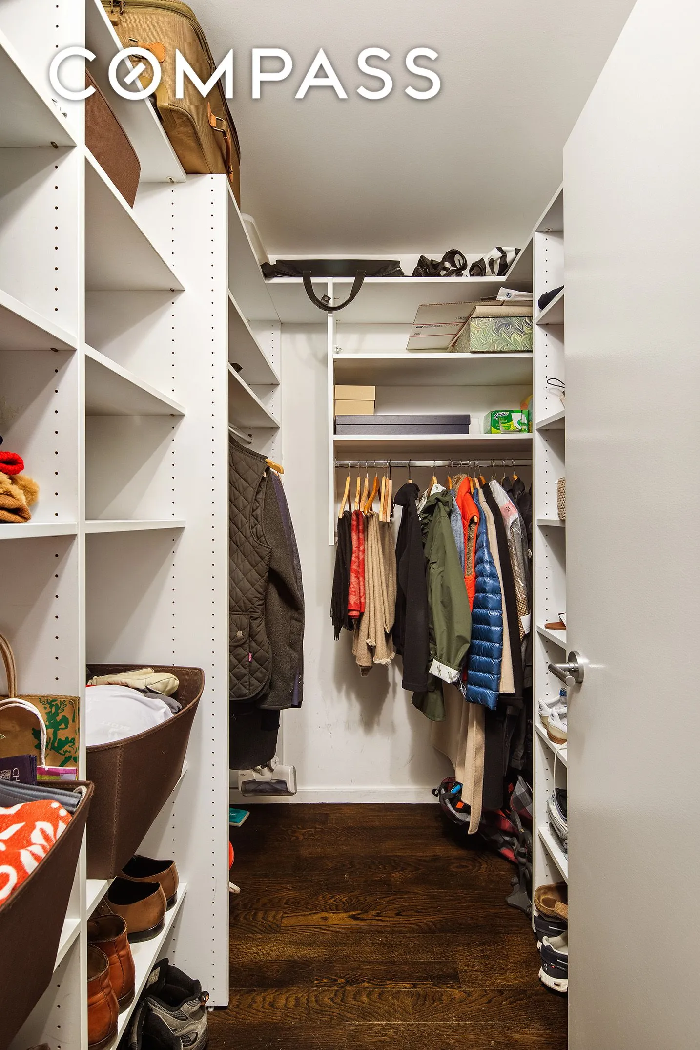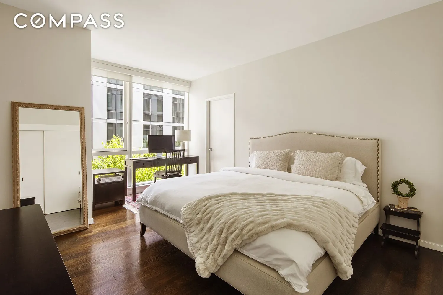 The second bedroom offers versatile functionality, whether as a nursery, guest room, or home office. It features two closets, including a walk-in, and its own en-suite bathroom with an oversized linen closet for additional storage.