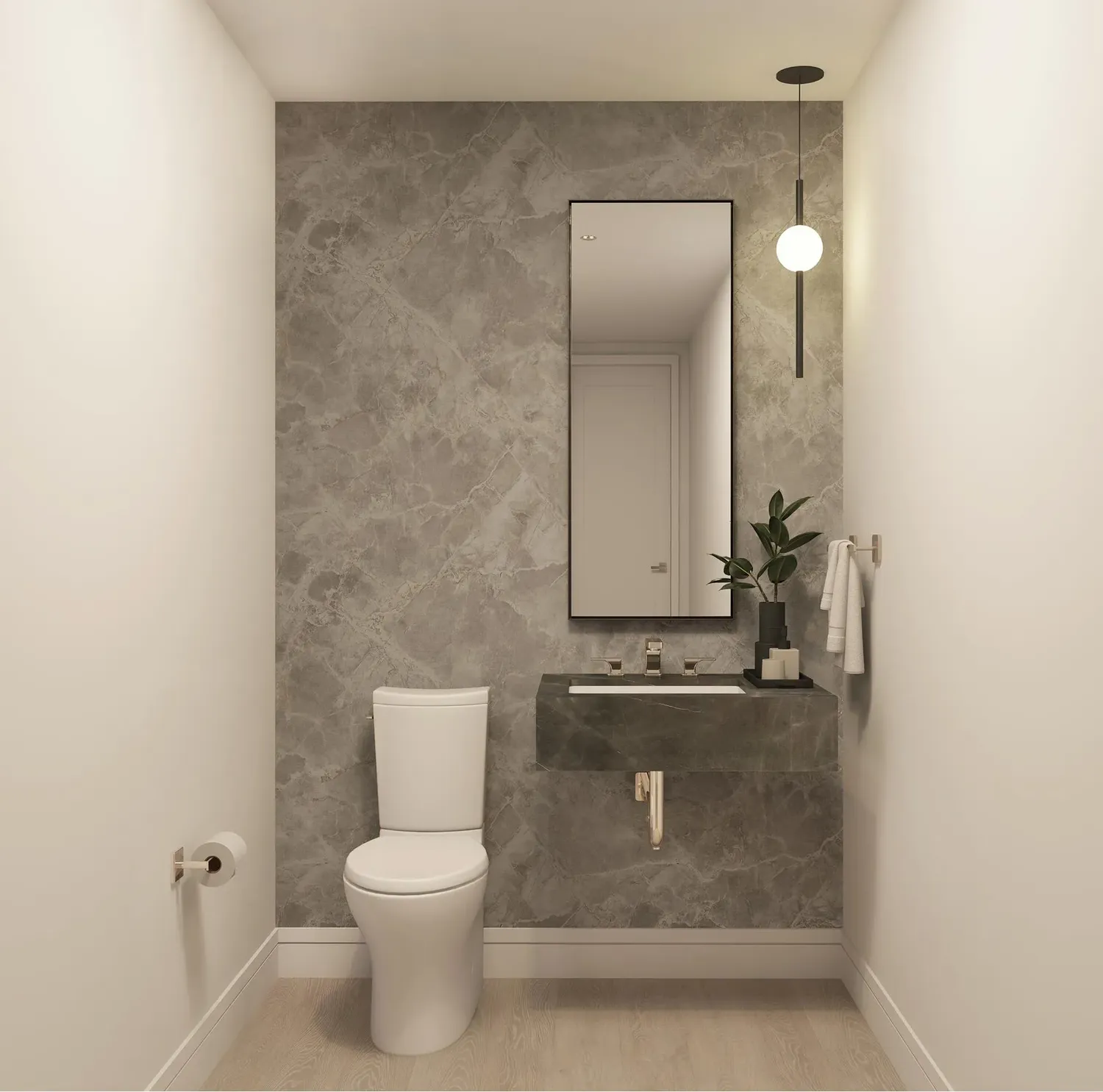 Introducing a seamless transition into the realm of personalized comfort provided by the VRF heating and cooling system. The residence unfolds its meticulously designed spaces with effortless sophistication from laundry closets, equipped with Miele washer and dryer to the elegant neutrals that pervade the Primary Bath palette. Cream-colored Perla Venata Quartzite stone floors set off the elegant Bianco Dolomiti walls, countertop and tub deck. A custom Tambour fluted wood-veneer vanity with blackened steel-frame mirrored medicine cabinet create pleasing shapes and lightly rendered lines that are in keeping with building's tightly tailored aesthetic. The theme of delicate tactility continues in the Secondary Bath, with finely grooved Sandy White ceramic tiles lining the walls, with Alfalux 2" square Italian made Torbole matte finish mosaic tile at the shower walls. Floors feature Alfalux Torbole ceramic tile, with a custom white lacquer vanity and Krion countertops in Snow White. A study in subtlety, the Powder Room walls are covered in grey Xtone Fiori di Bosco large format sintered polished marble tiles. The moody shade of the custom Grafite honed marble stone slab vanity completes the composition.