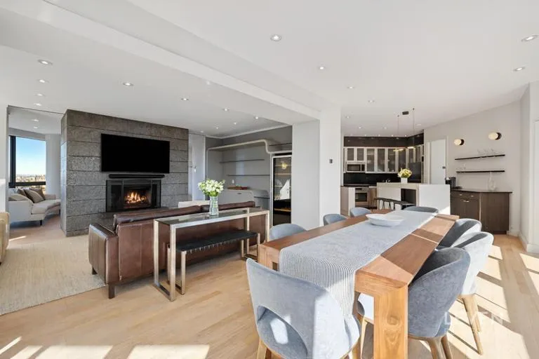 Designed with comfort and elegance in mind, the home features two wood-burning fireplaces, adding warmth and character rarely found in condominium living. The spacious open kitchen has been thoughtfully enhanced with a brand-new breakfast area and expanded countertop, seamlessly connecting to the main living spaces and creating an ideal flow for hosting.