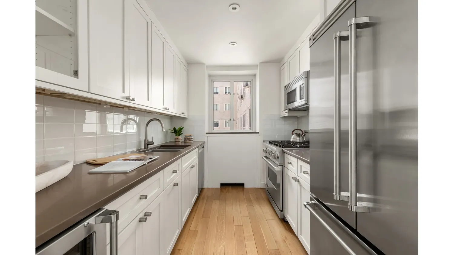 The entry hall with two large walk-in closets, opens to the foyer then into a huge North facing living/dining area as well as into the cabinet-laden kitchen featuring all Viking Professional Series appliances: French door refrigerator with double drawer freezer, wine refrigerator, four-burner range, dishwasher, microwave and Caesarstone countertops, custom shaker cabinets with slow closing drawers and great storage.