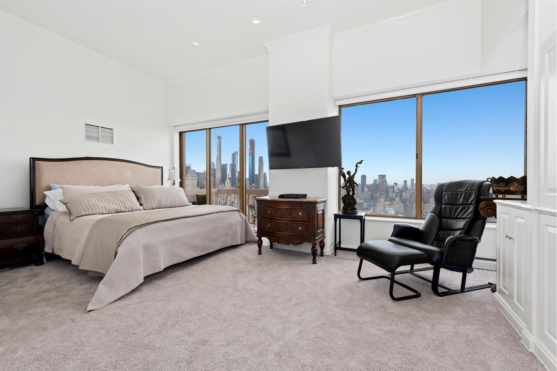 Price Reduced !! Luxury living among the clouds. Unit 36A is a magnificent split two bedroom with 2.5 marble baths on a high floor. You can truly appreciate the stunning views of Central Park and all of NYC, from the two balconies - one off the living room and the other off the master bedroom. There is an abundant amount of closet space plus a washer/dryer in the unit. Unique from most 2 bedrooms in the building, the ceiling height in the bedrooms is over 11 Ft making the space feel grand and bright. This full service building's amenities include a fulltime Doorman, Concierge, Health Club, Garage, Storage and Outdoor Common areas. Pets are not permitted for renters.