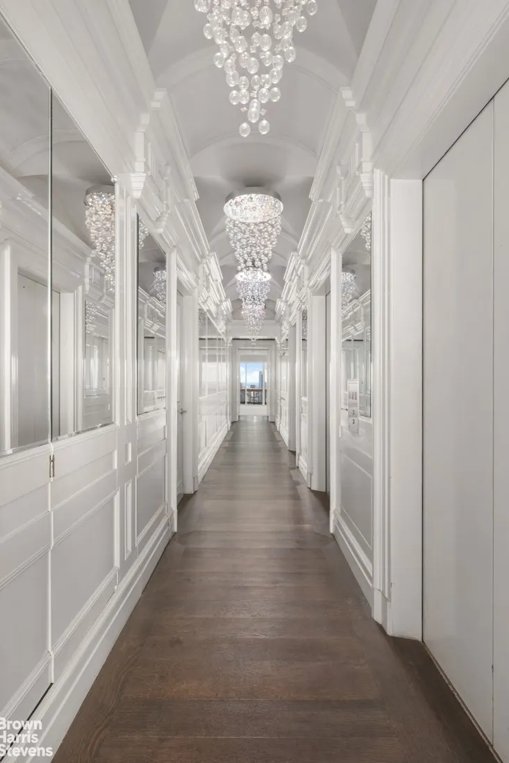 The western wing features a 30-foot living room with hand-laid oak parquet de Versailles floors and a balcony overlooking Central Park. The eastern wing boasts a more relaxed living and dining area beneath 12-foot coffered ceilings, complete with antique chestnut floors, a breakfast nook, and an open Gaggenau chef's kitchen with custom cabinetry and two additional balconies.