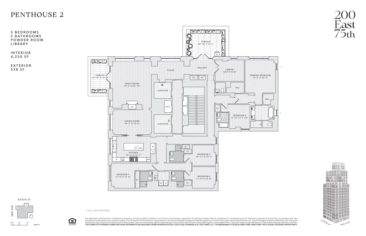 Penthouse 2 is a 5 bedroom, 5-and-a-half-bathroom apartment with a formal dining room and library and 2 lovely terraces, all with open city, pretty views, and lots of sky.