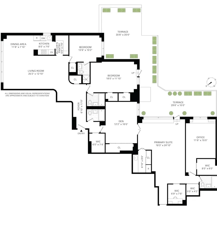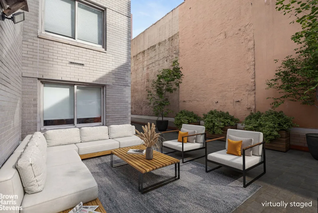 The "backyard" is an extraordinary wraparound terrace of approximately 750 square feet. Fully equipped with lighting, electricity, and water hook-ups, this private outdoor oasis is ideal for dining, lounging, and year-round enjoyment.
