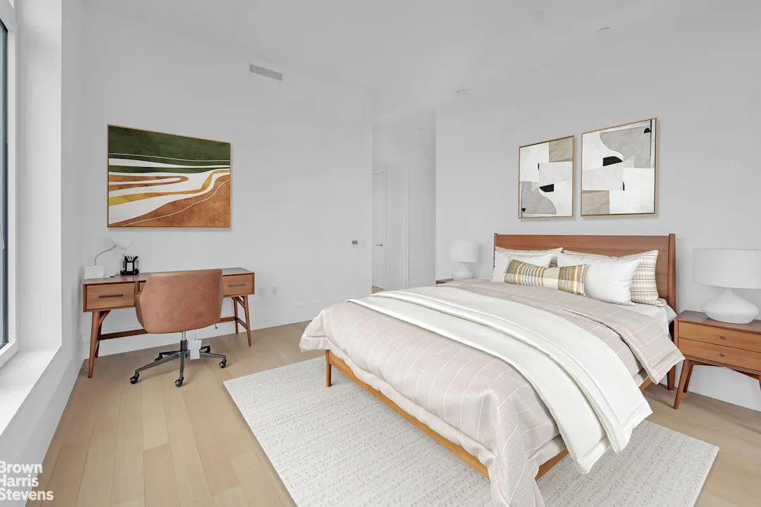 The primary suite is a serene retreat, tucked away from the main living areas with bright southern and eastern exposures, including the East River and beyond and miles downtown. A huge walk-in closet, and two more large closets provide very generous storage, while the five-fixture marble-clad bathroom boasts heated floors, a windowed rain shower with fabulous downtown views, a deep soaking tub, a separate water closet, and dual medicine cabinets above a light oak and marble vanity. Both additional bedrooms feature huge open views, large closets and en-suite marble bathrooms, with Kohler and Waterworks fixtures.