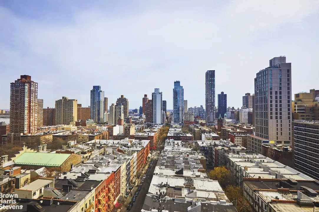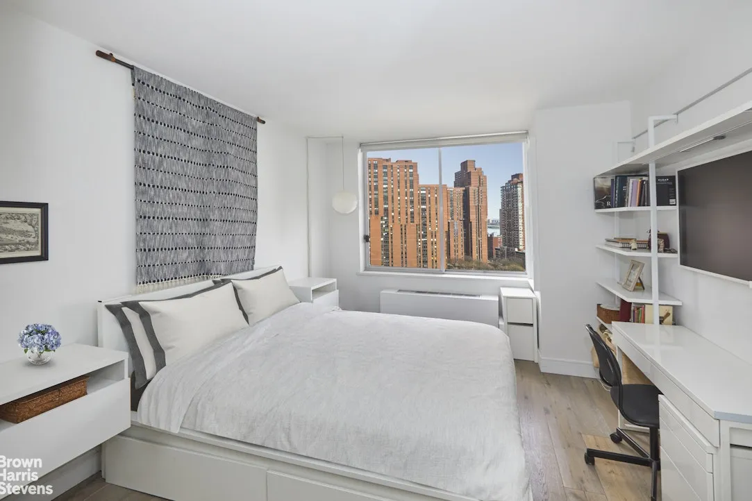 Fully renovated 1-bedroom condo in the Upper East Side featuring a bright corner layout with a dramatic wall of windows showcasing sweeping East River and skyline views.