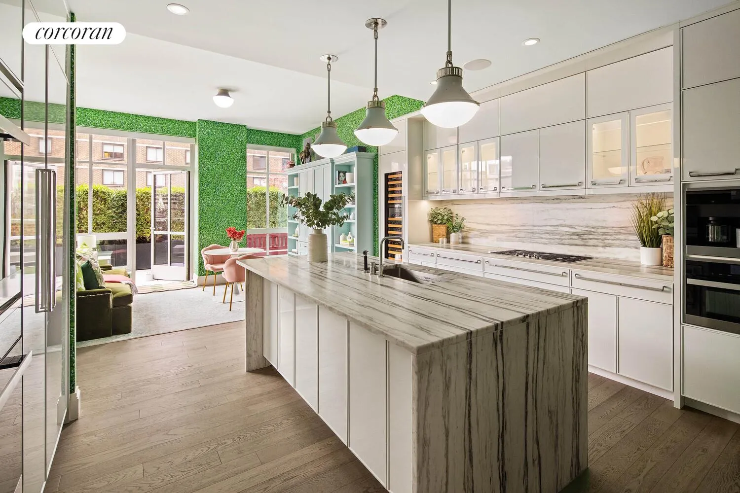 The open chef's kitchen is appointed with Montclair Danby marble countertops, premium Miele appliances, a wine refrigerator, and generous custom cabinetry. A welcoming eat-in lounge area with built-in TV cabinetry makes this space as comfortable as it is functional, while a beautifully designed powder room completes the main living area.