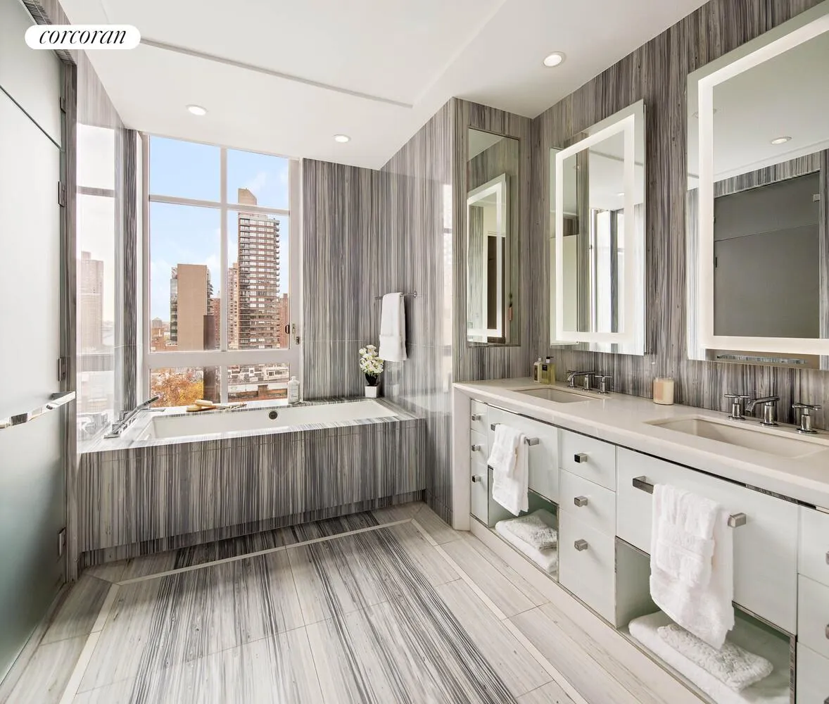 Designed by top AD 100 interior designer Celerie Kemble, this one-of-a-kind five-bedroom, four-and-a-half-bath residence is infused with lacquered walls, bespoke millwork, rich textures, and a refined palette that balances classic elegance with modern warmth. Floor-to-ceiling windows with south, east, and west exposures bathe the interiors in natural light and frame sweeping city views.