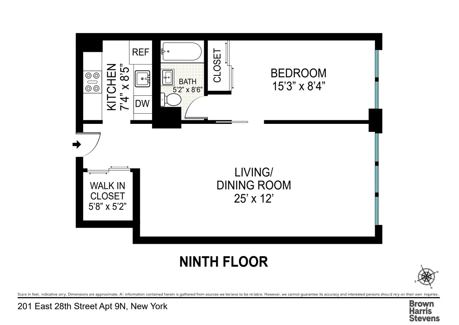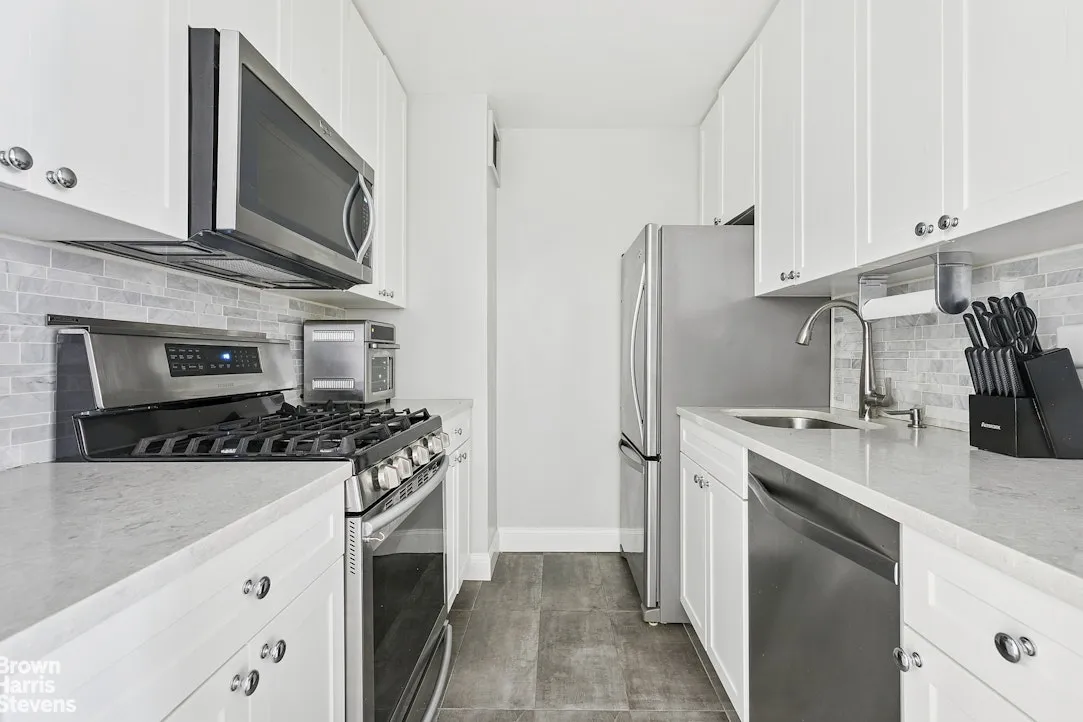 The home opens into a bright and expansive living and dining area, accented by sleek espresso wide-plank floors and oversized windows that frame the New York skyline. Just off the entry, a large walk-in closet provides exceptional storage. The renovated kitchen blends style and function with modern cabinetry, stainless steel appliances (Dishwasher, Microwave, Gas Range and Full Size Refrigerator), and generous counter space.