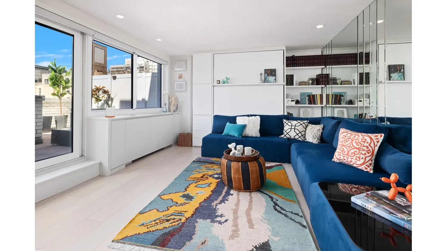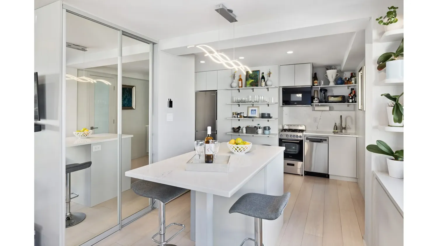 This special residence offers studio-living like no other. The chic living area features an L-shaped, bespoke, Imperial blue-velvet sofa built-in, that effortlessly transforms into a queen-sized bed. You'll enjoy cozying-up in this inviting room, whether day or night, while taking in the views from the wall of windows. Seamlessly transitioning the living space into the kitchen is a storage-filled, quartz topped island that functions as both a dining table and chef's prep space. The sleek and polished kitchen offers open shelving, stainless appliances (including a dishwasher), and more hand-crafted cabinetry.