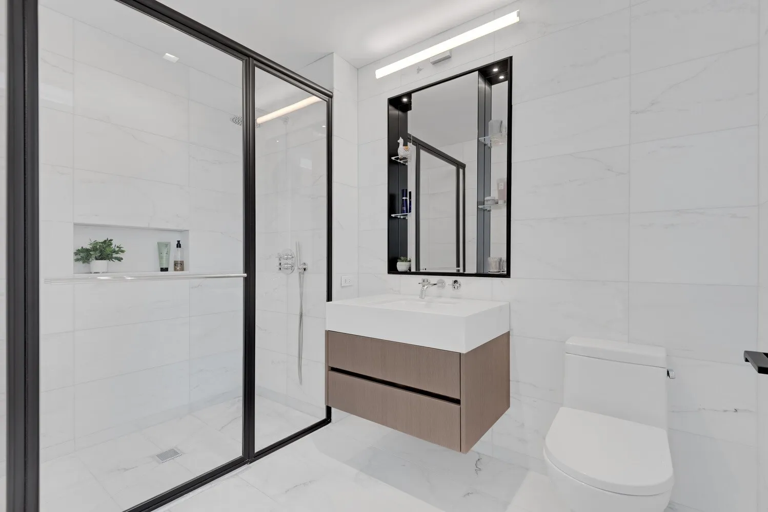 Spa-Like Finishes: Primary bathroom wrapped floor-to-ceiling in Calacatta Lincoln marble with radiant heated floors, polished nickel fixtures, and a floating marble vanity.