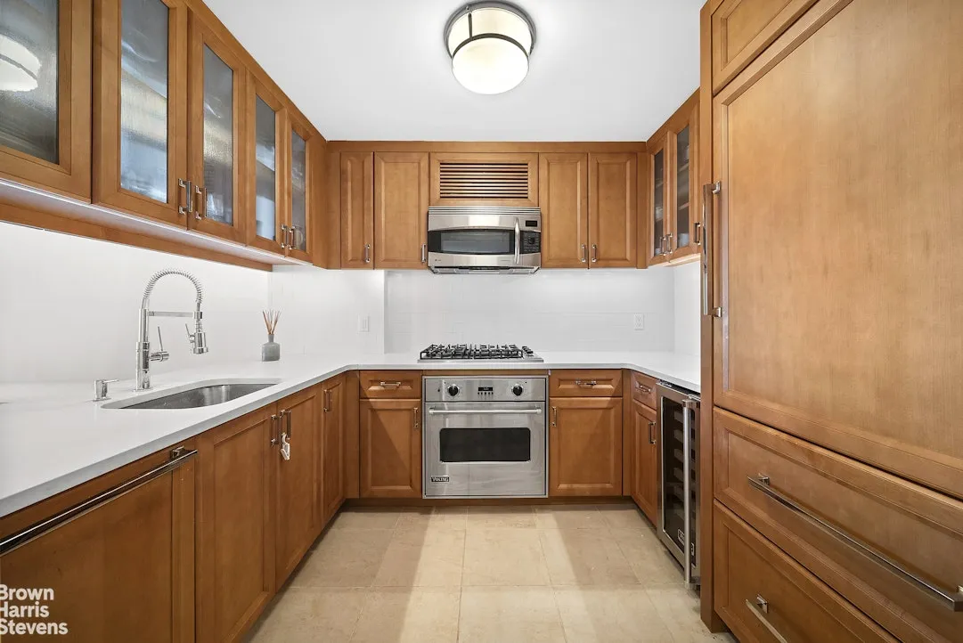 On entry you are met with a gracious foyer with powder room, Miele washer and dryer, and French White Oak Herringbone floors that continue past your chef's kitchen and into a spacious living room. The chef's kitchen with white quartzite counters features full-sized Sub-Zero fridge, Viking range and wine fridge, Miele dishwasher, and GE combo convection oven/microwave. The living room continues the herringbone floors through to ample space for both living and dining, and three large floor-to-ceiling windows and high ceilings. The second bedroom,is just off the living room and can be joined for a grand space, used as an office, or as originally intended as a gracious bedroom with large closet and en-suite full bath.