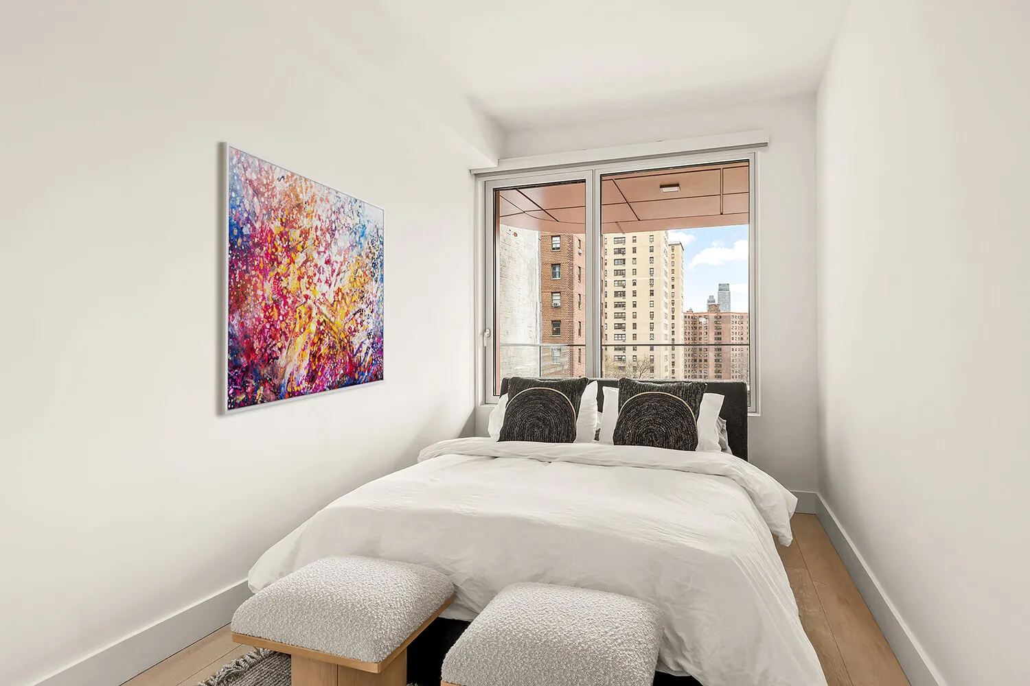 Residence 7B is a stunning example of the building's signature elegance. This two-bedroom, two-bathroom home spans 743 square feet and offers a rare sense of indoor-outdoor flow, anchored by a private 268-square-foot terrace with wide-open skyline views to the east.
