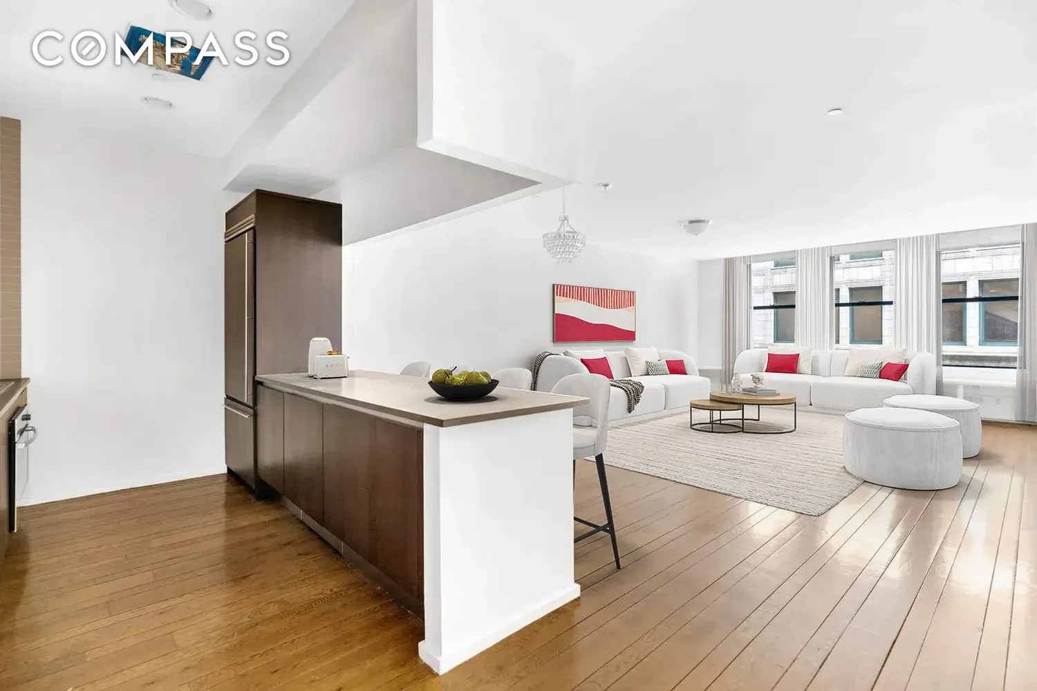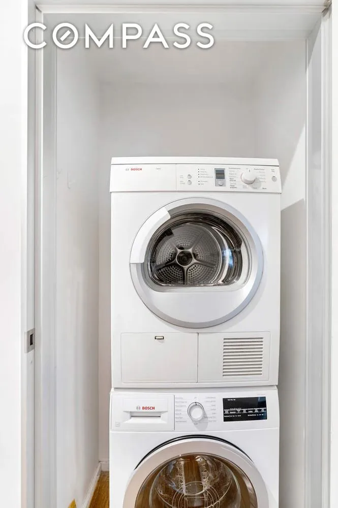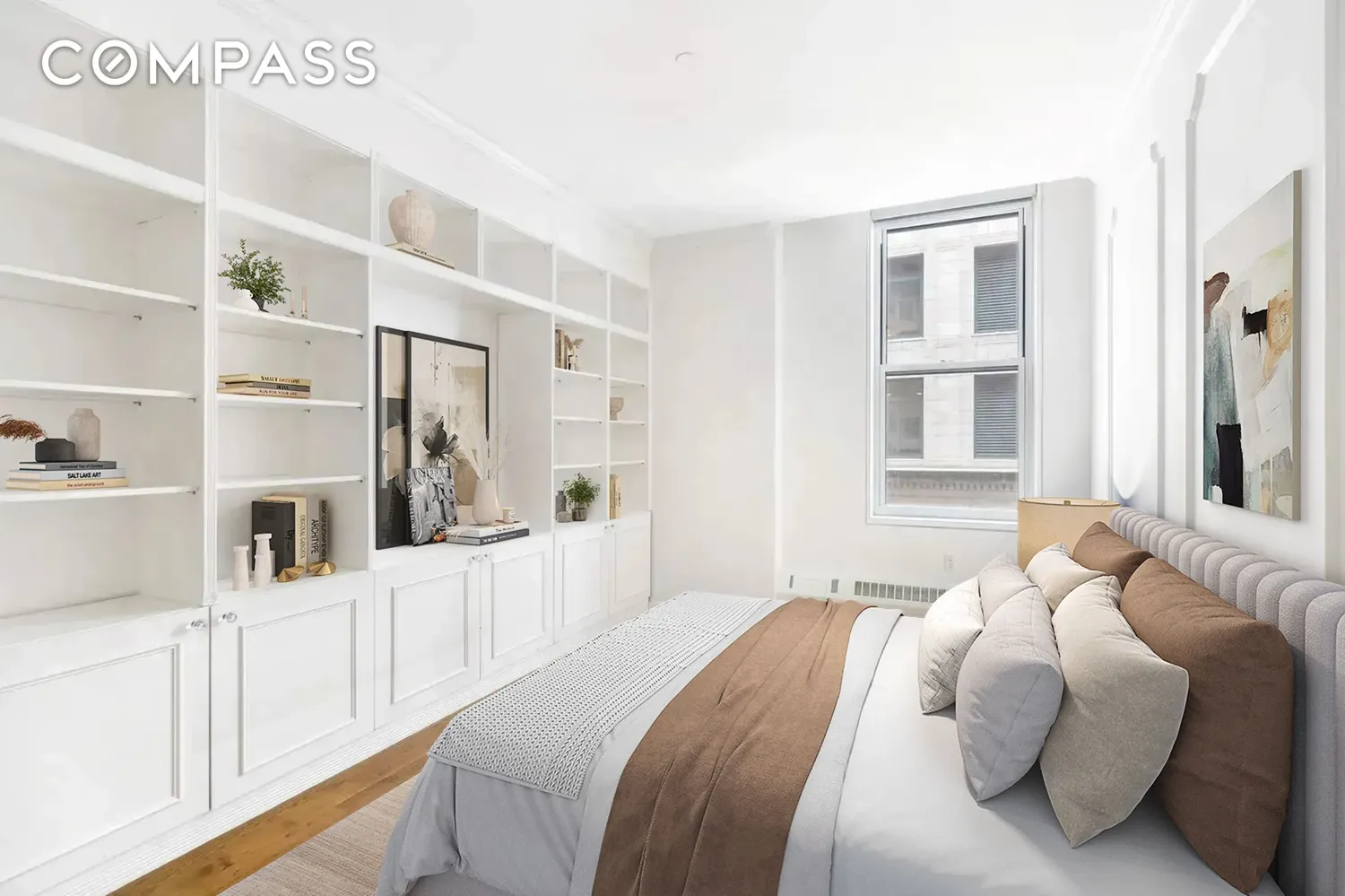 Notable features include extensive custom storage throughout the apartment, highlighted by a substantial walk-in closet, as well as an in-residence washer and dryer. A large private storage room transfers with the apartment; an uncommon and highly valuable amenity in Manhattan. Central air conditioning and heating ensure year-round comfort, while wide-plank white oak floors add warmth and sophistication throughout.