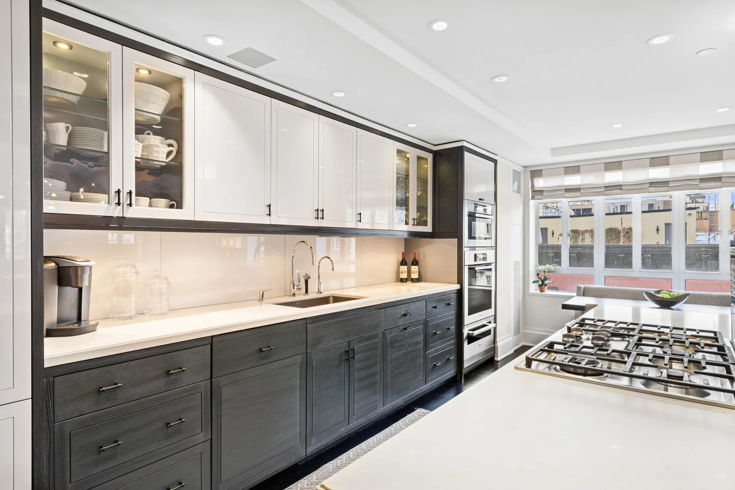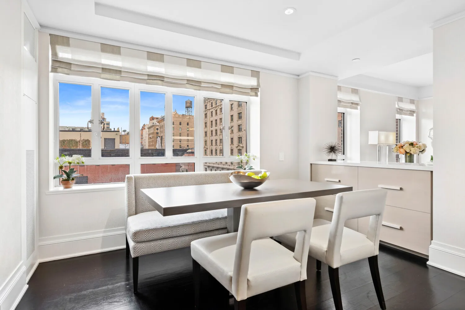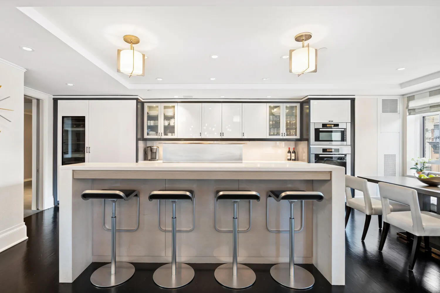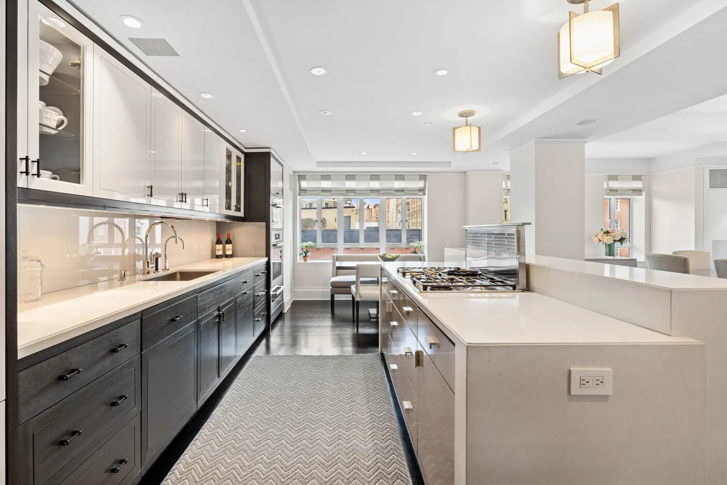 A spacious entry foyer welcomes you into a dramatic gallery leading to all entertaining rooms with tree lined views onto Madison Avenue. The grand living room is nearly 19 feet by 23 feet with sunny Eastern exposures. The formal dining room faces East as well and easily accommodates a large dinner party. The sunny, corner windowed eat-in kitchen/great room has ebonized wood floors, custom wood and pale grey lacquered cabinetry, polished stone countertops, Miele appliances and Dornbracht fixtures. It is a chef's dream kitchen and a wonderful place to relax while cooking and eating.