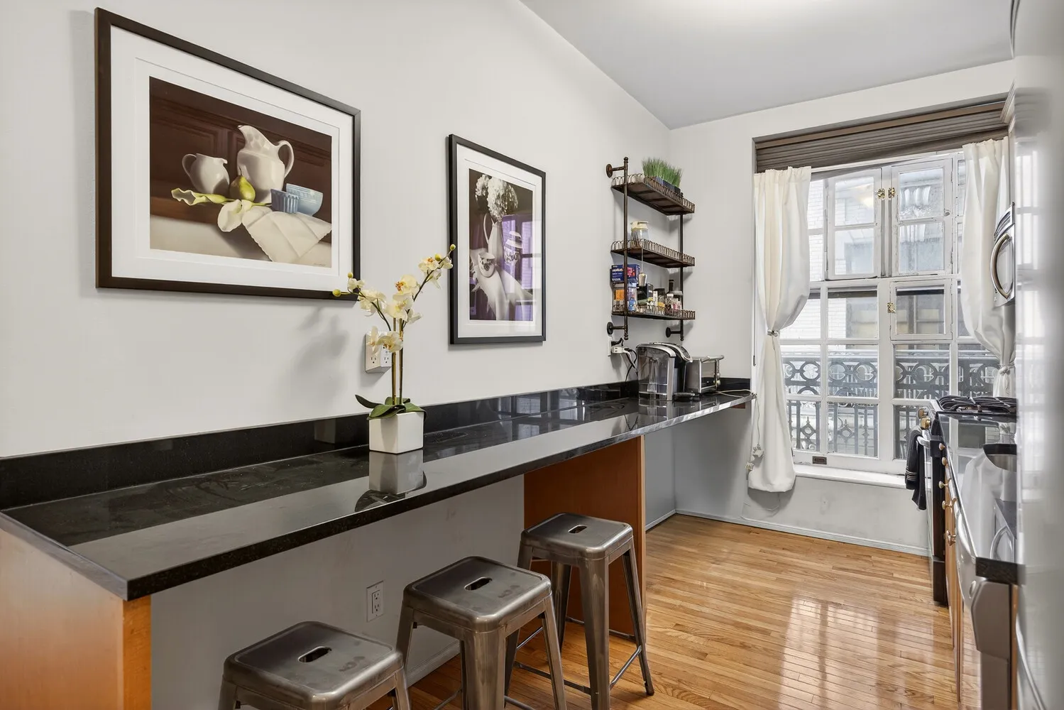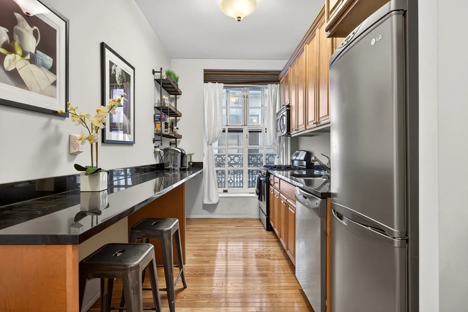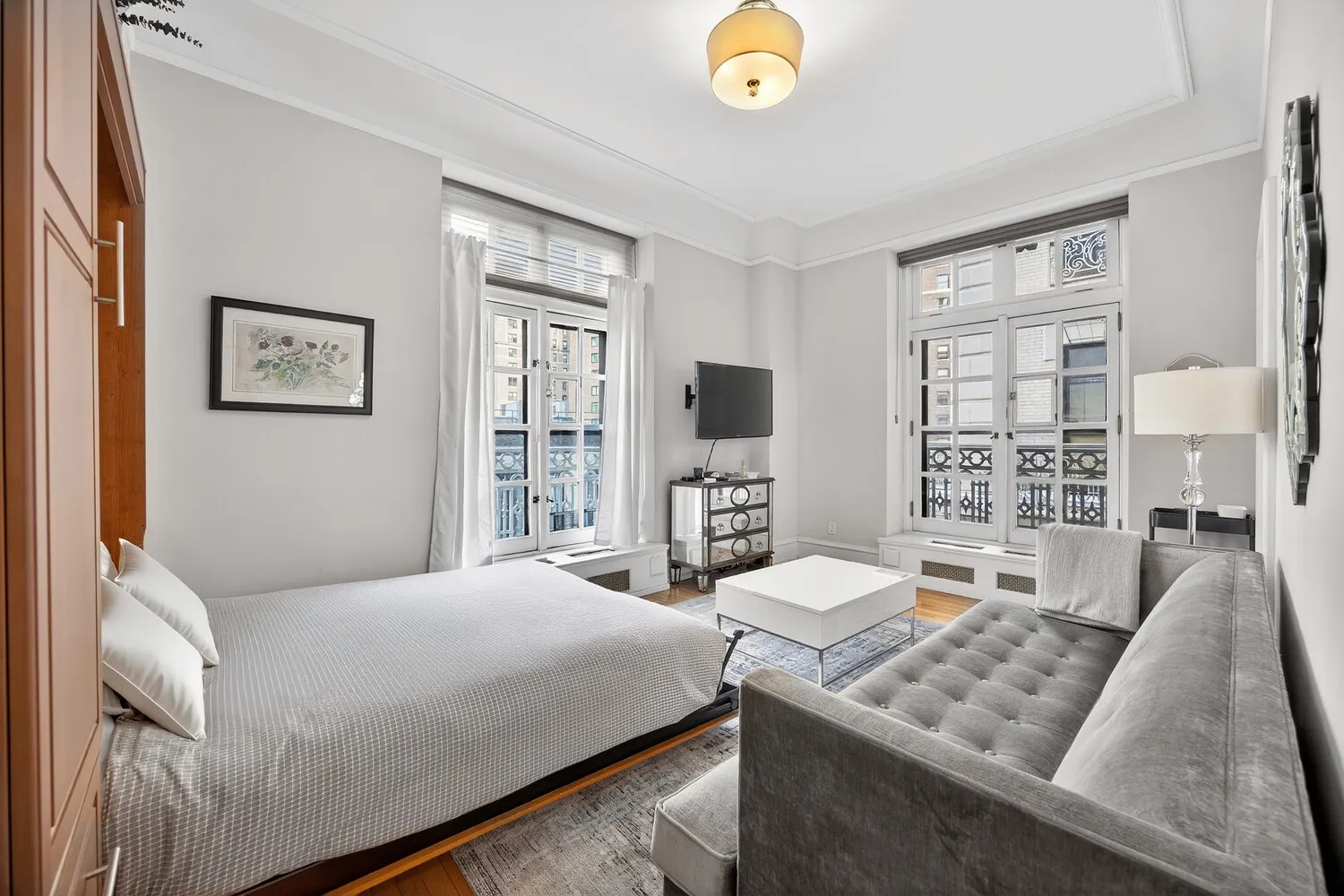 This spacious and beautifully renovated studio has a built-in murphy bed, huge windows, an enormous custom closet, and an updated bathroom with a tub/shower combo. The big windowed kitchen has tons of cabinets and counter space, a breakfast bar that seats 3, and a dishwasher.