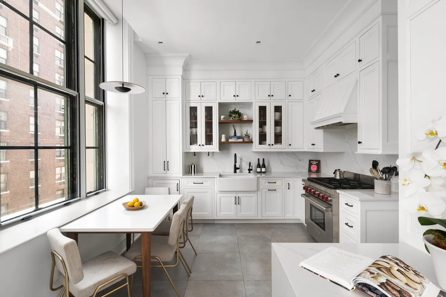 The windowed eat-in kitchen is a chef's dream, featuring marble countertops, custom cabinetry, and top-of-the-line Wolf, Sub-Zero, and Miele appliances.
