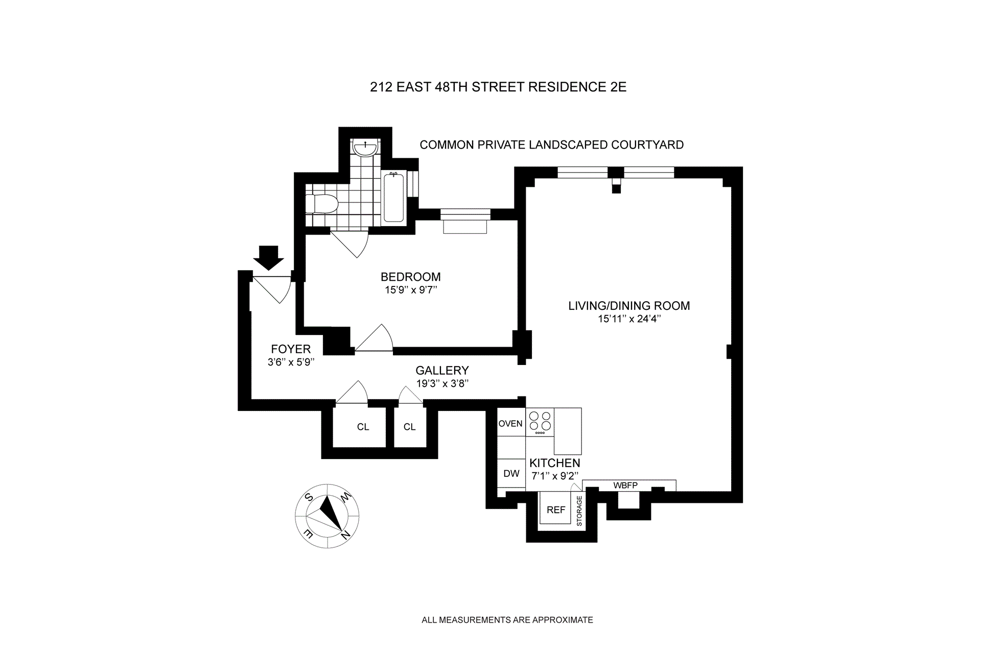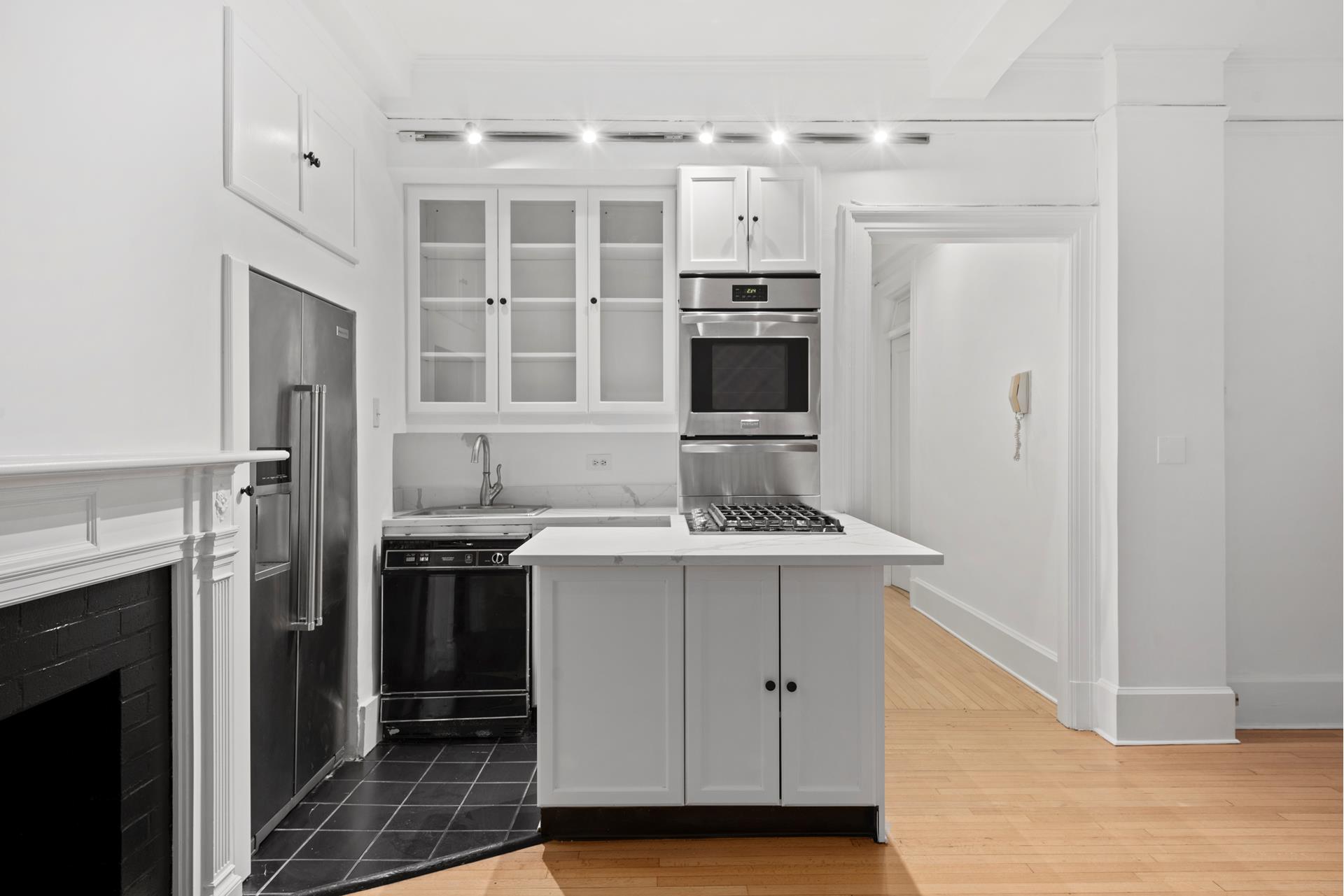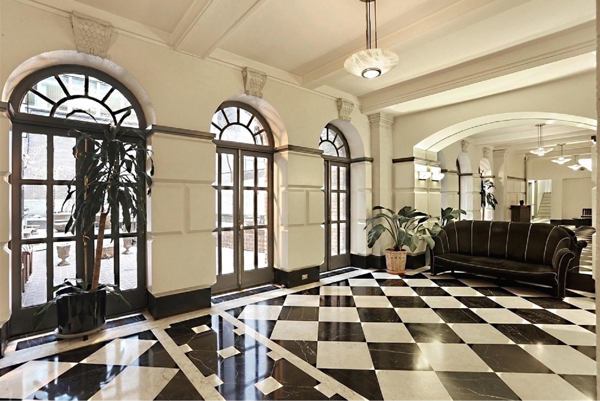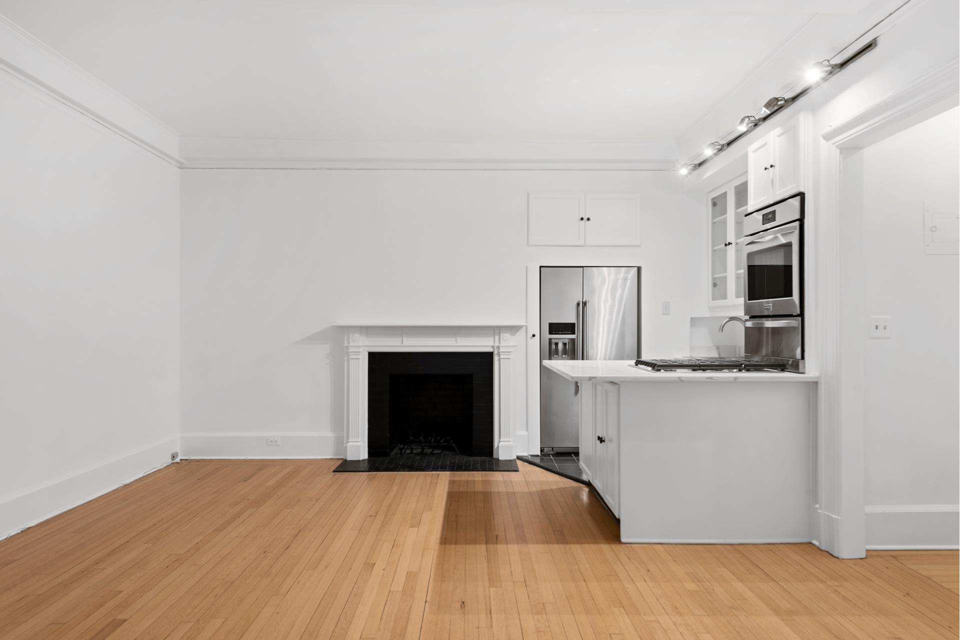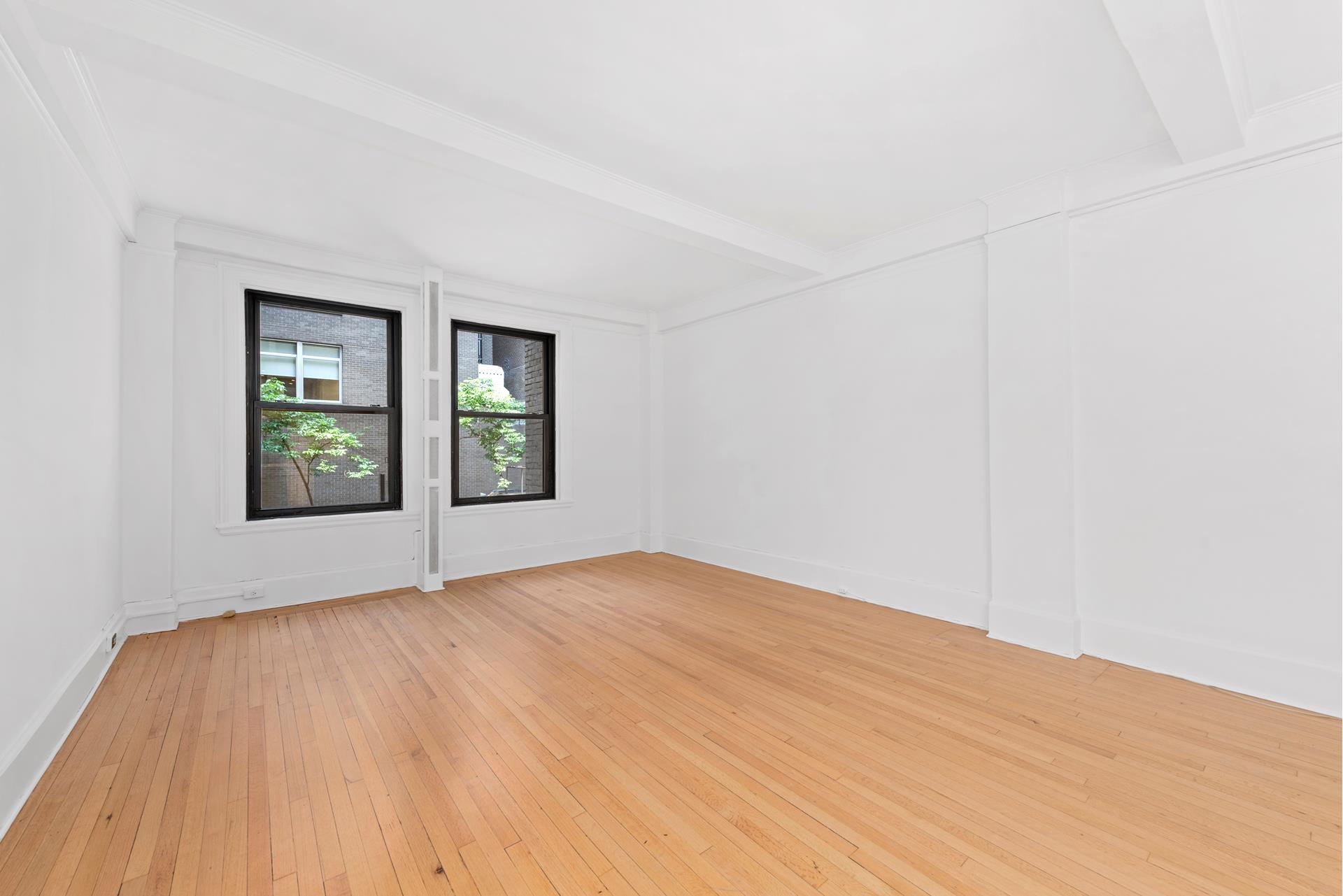 Enter this one bedroom, one bathroom gem through a long gallery into a grand living and dining room with an open kitchen and a working fireplace. Enjoy oversized windows overlooking the common private landscaped courtyard. With elegant pre-war details including soaring beamed ceilings, a wood-burning fireplace, natural hard wood floors, charming apartment 2E is warm and inviting, with a gracious bedroom and en-suite bathroom, both with garden-facing windows. The apartment has an abundance of floor-to-ceiling closets as well as a 3'5" x 5' storage space within the unit.