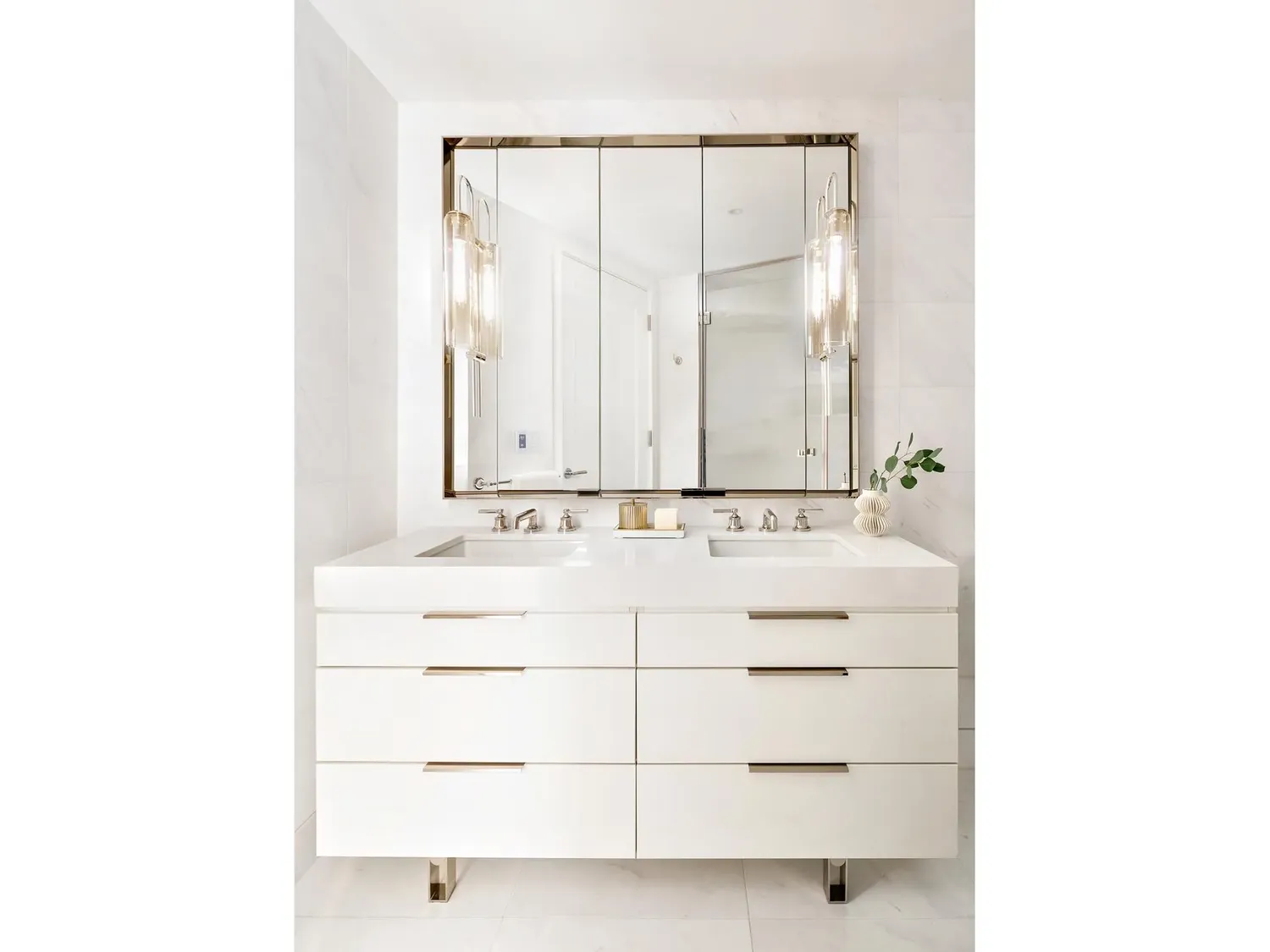 The primary bedroom features an oversized walk-in closet and a five-fixture bath with Venus White marble tile floors and walls, millwork vanity clad in leathered textile and featuring deep drawers for storage, custom-designed medicine cabinets and wall sconces by CetraRuddy, and polished nickel fixtures by Waterworks throughout.