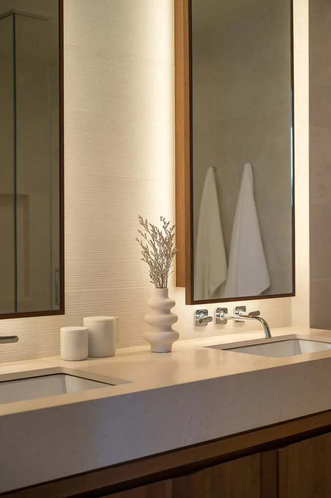 As you enter the primary bedroom suite, just past the side by side Miele washer & dryer, the tranquil space features an enormous walk-in-closet, while in the en-suite five-fixture primary bathroom boasts a striking backlit fluted wall, a custom dual-sink vanity with Italian Lymra countertops, and polished chrome fixtures. Heated floors and a frameless shower glass enclosure complete the main bath.