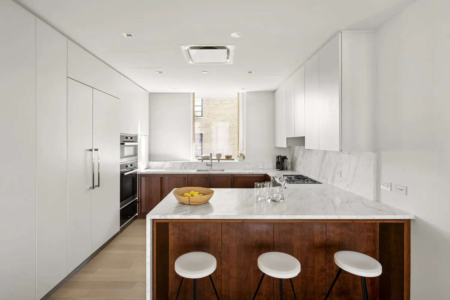 Upon the dedicated elevator entry, the gallery wall lends way to the light filled living and dining room. The chef's kitchen centers the home, featuring custom-stained wood and Ghiaccio grey lacquer cabinetry with bevel detailing, hand-selected European high-honed Volakas marble countertops and backsplash, and a best-in-class suite of Miele appliances with wine refrigerator.