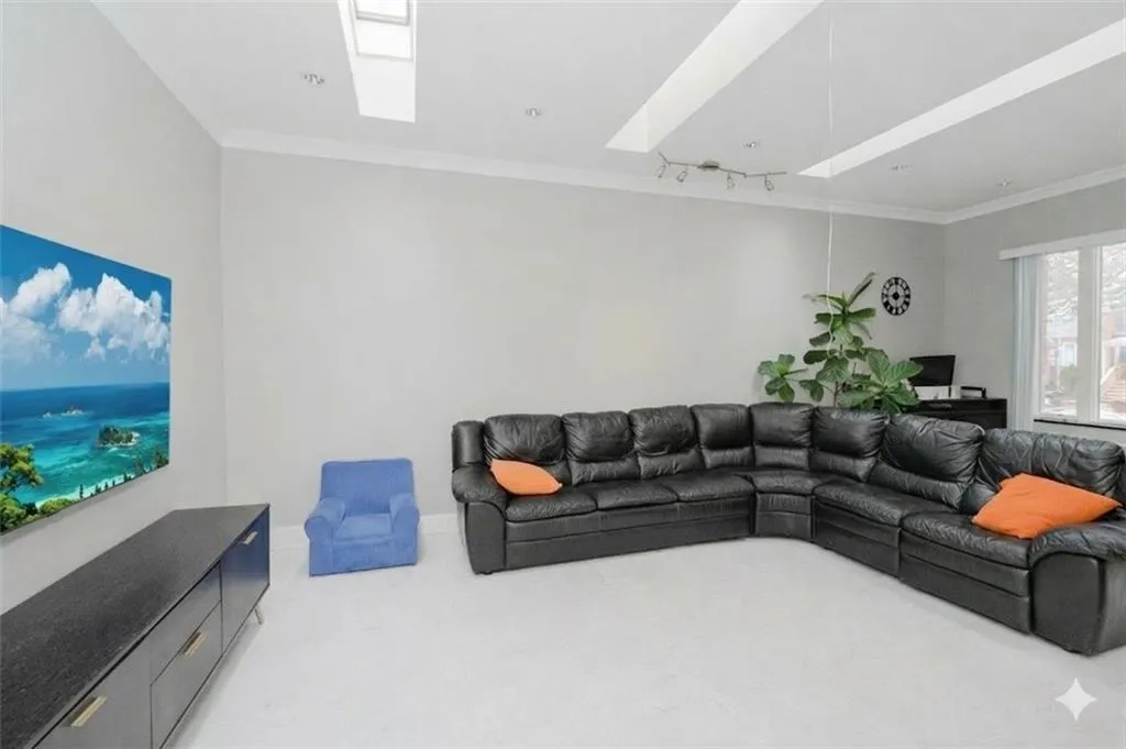 The main level offers a beautiful eat-in kitchen with granite countertops, black enamel appliances, and a bright dinette area. A spacious living room with skylights fills the home with natural light, while two generously sized bedrooms and a fully tiled bathroom complete this level.