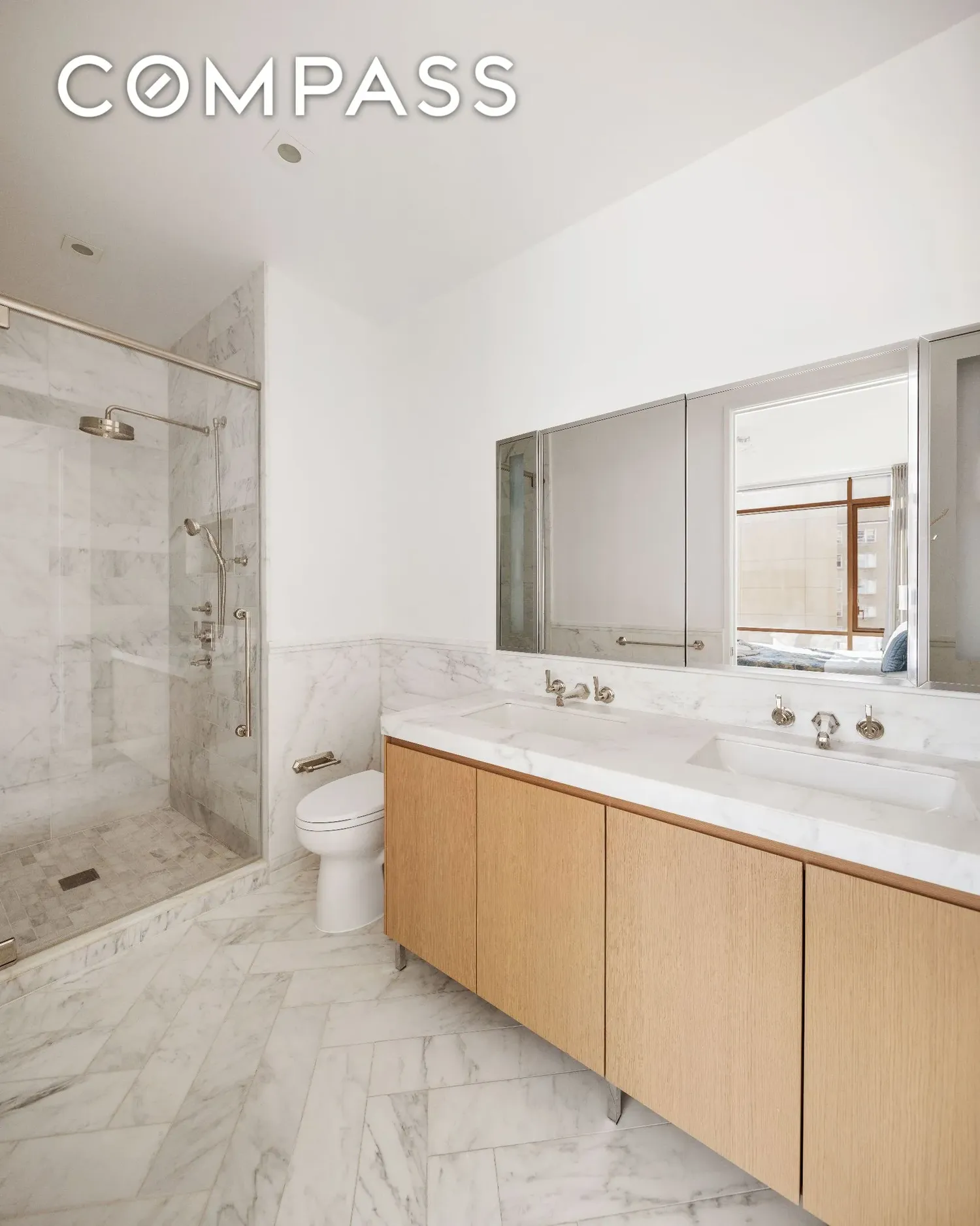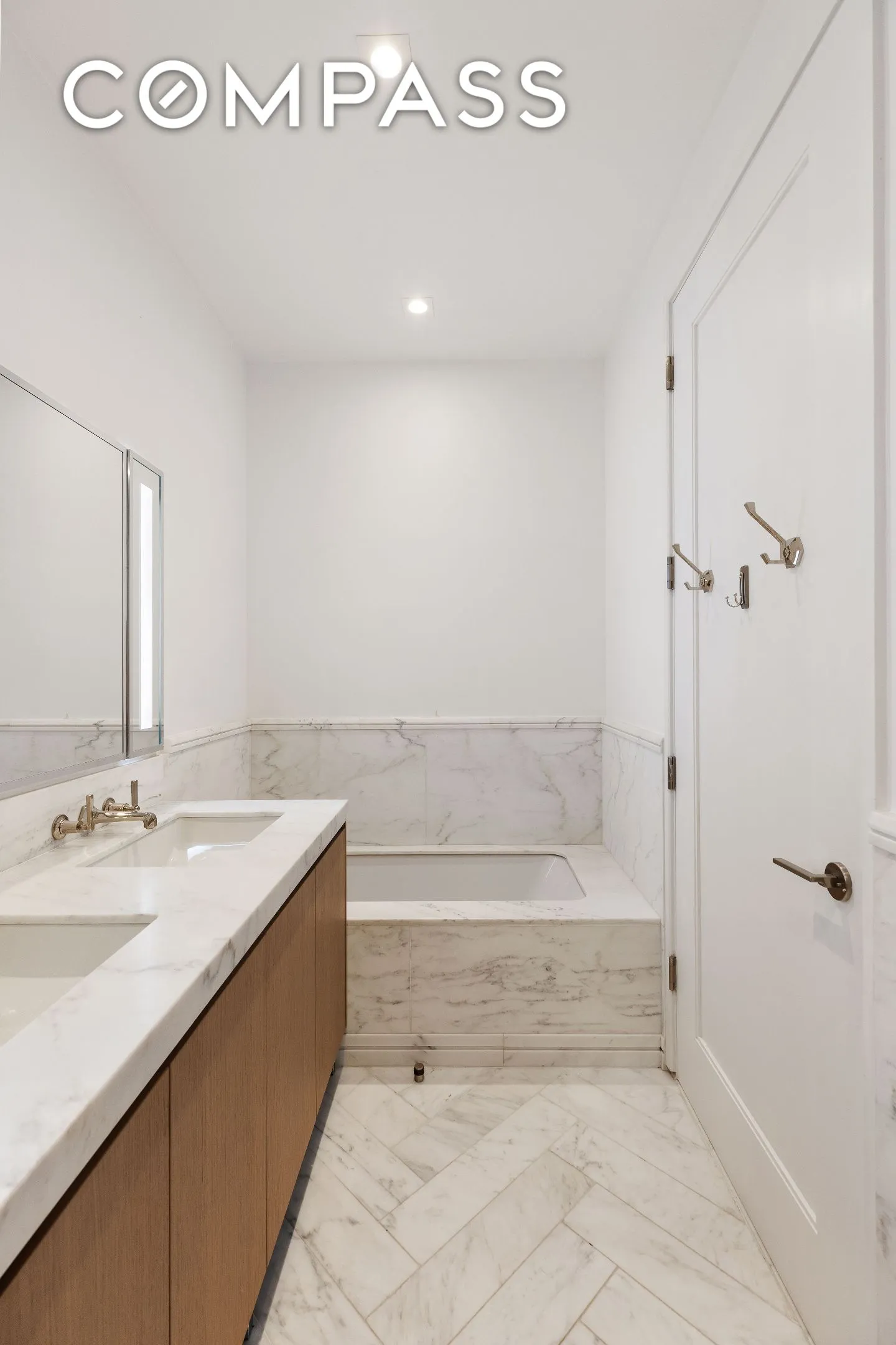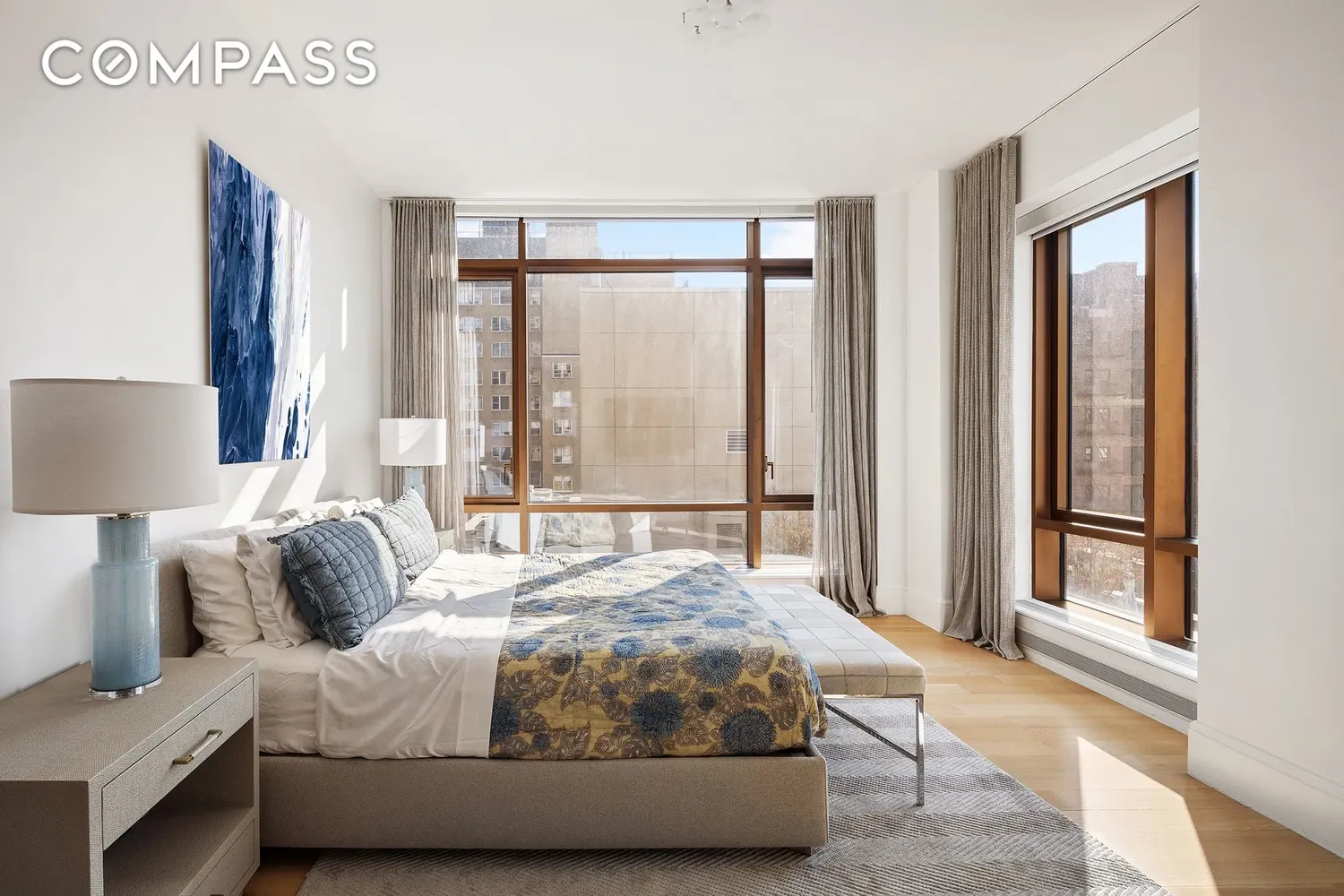 The serene corner primary bedroom suite serves as a peaceful retreat from the city's energy. The room comes equipped with a fully built out generous custom closet, eclectic shades and en-suite bathroom with exquisite marble accents, a deep soaking tub and a glass-enclosed shower.