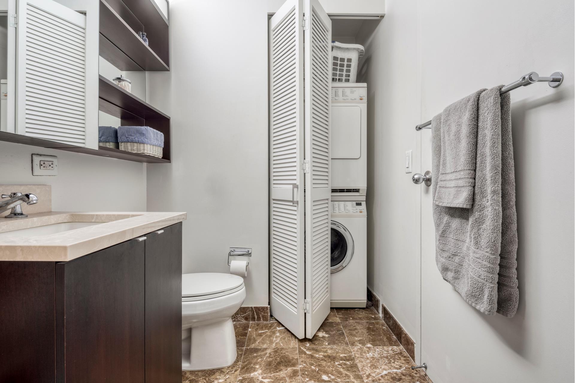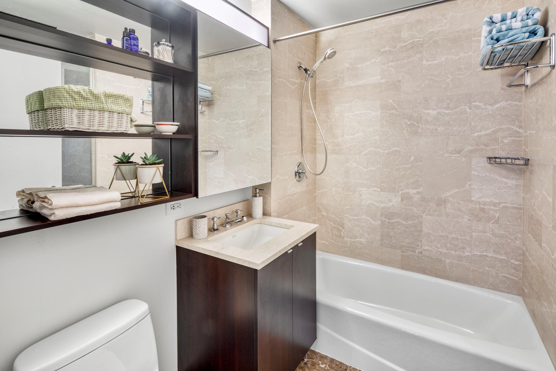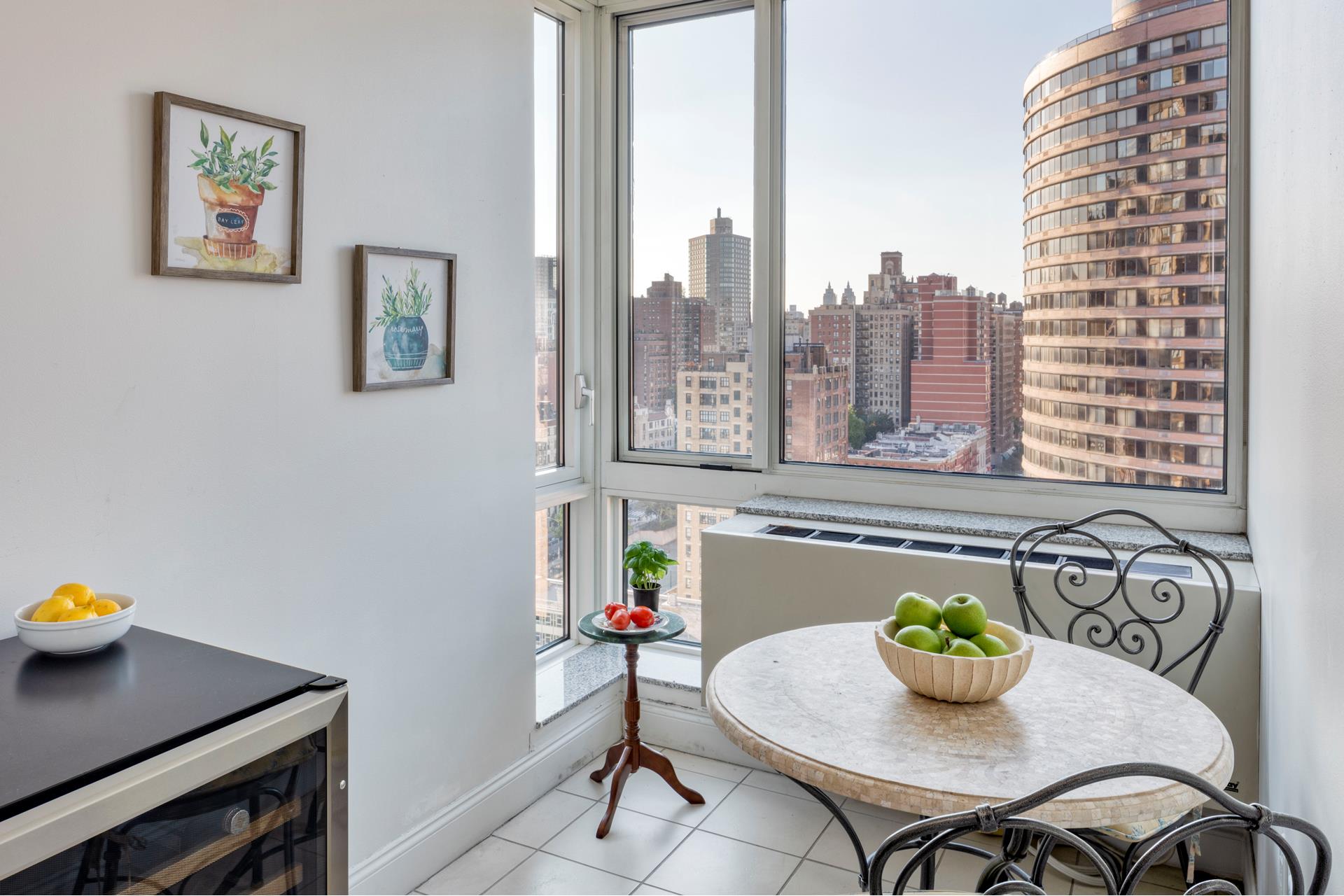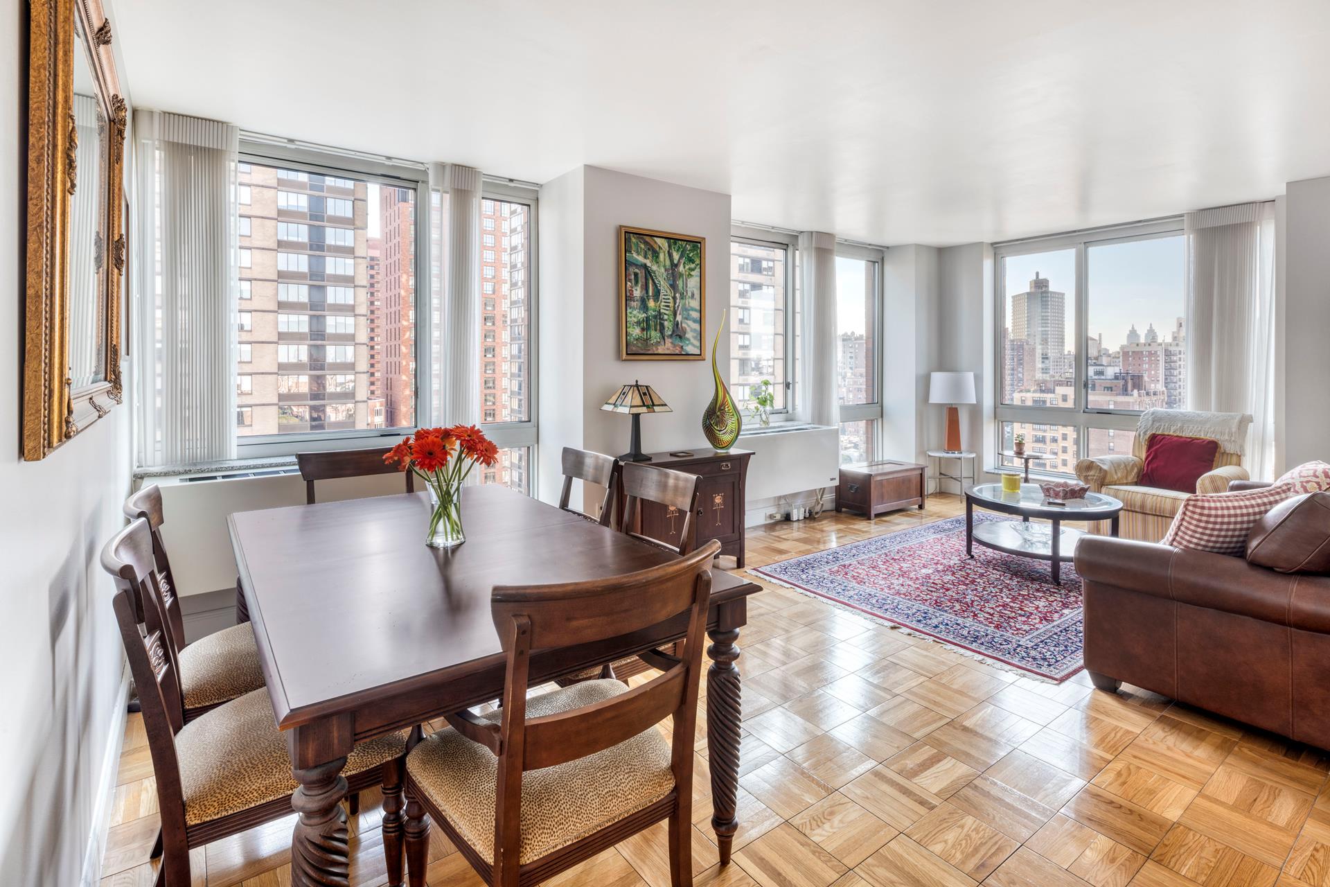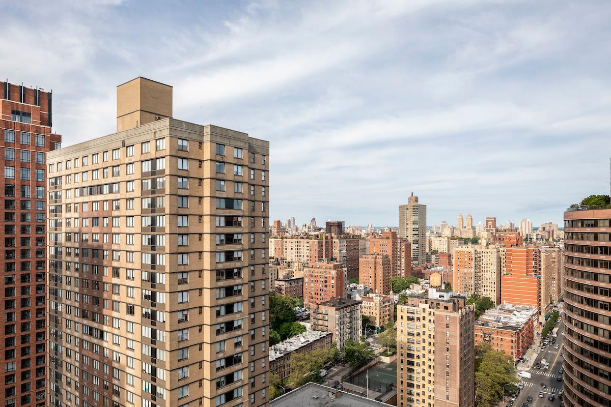 Perched on the 23th floor of One Carnegie Hill, this bright and spacious corner 2BR/2BA boasts tons of light from southwestern exposure. Enter through an ample, elegant foyer and find yourself in a large living room with plenty of space for a full-sized dining table; the sunny, high-end kitchen is fully equipped with top-of-the-line stainless steel appliances and includes a breakfast nook. (Kitchen can be opened up if desired; please consult your architect.) Both bathrooms are completely tiled with marble and offer beautifully appointed vanities and cabinets. The master bedroom has an en-suite bathroom with separate stall shower. Perks include floor-to-ceiling windows with custom remote controlled window treatments throughout and in-unit W/D.