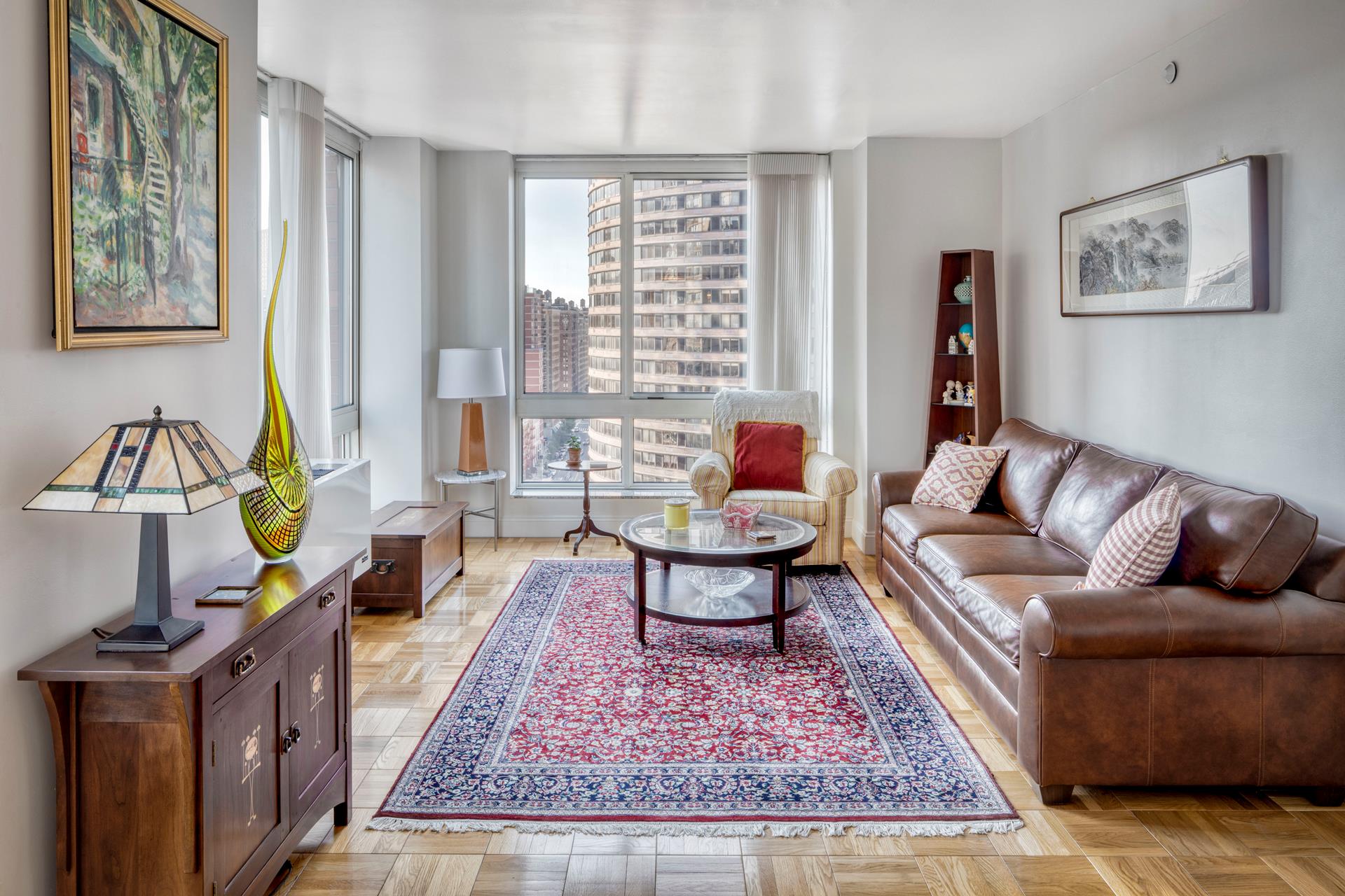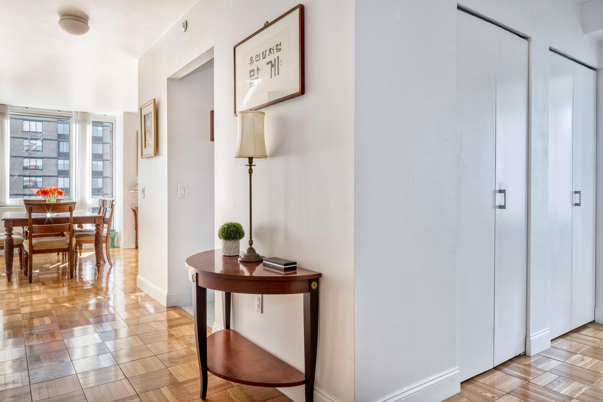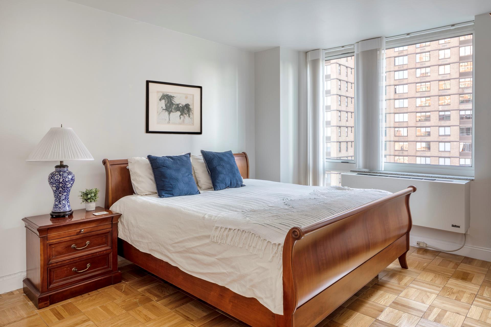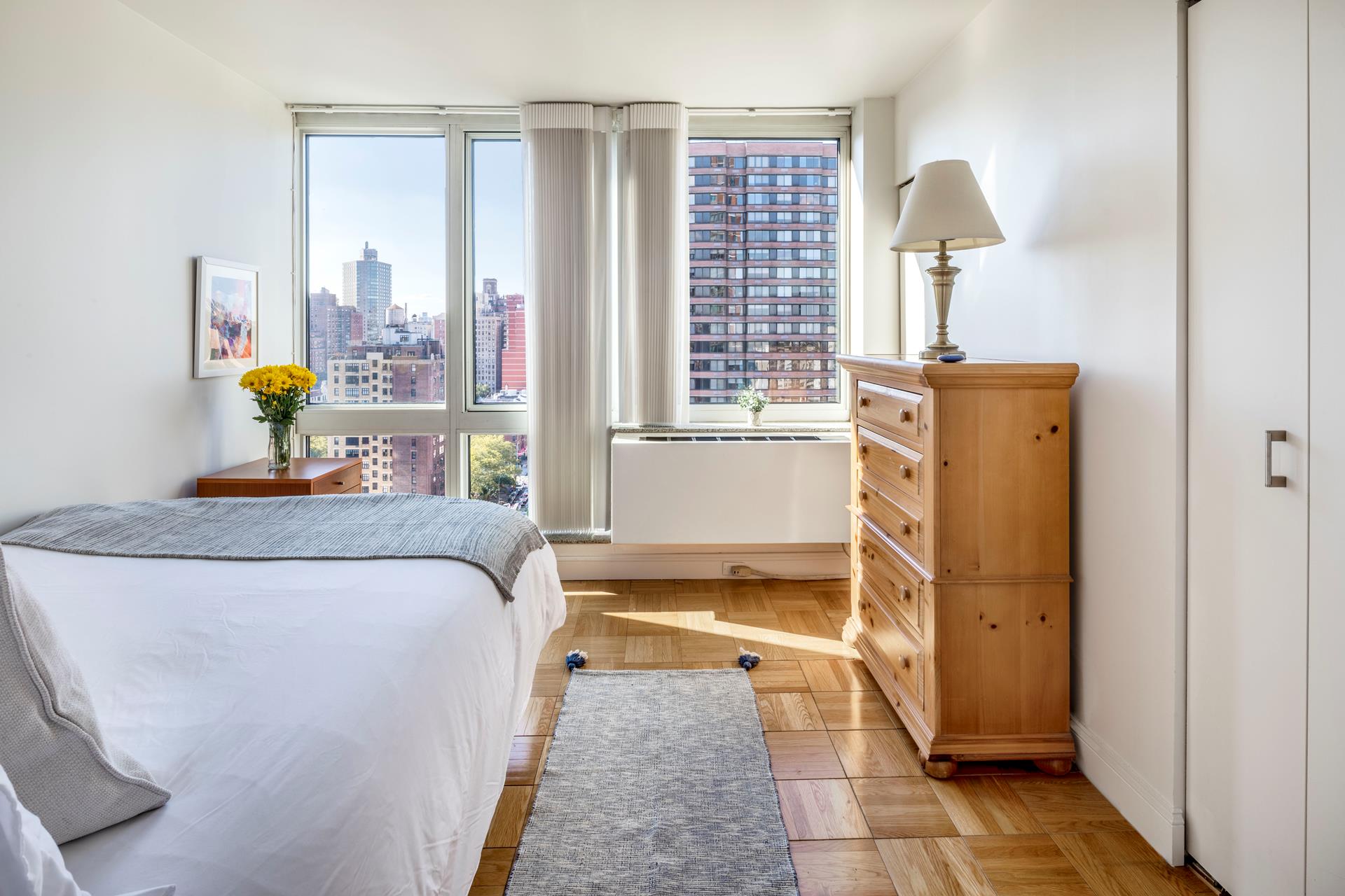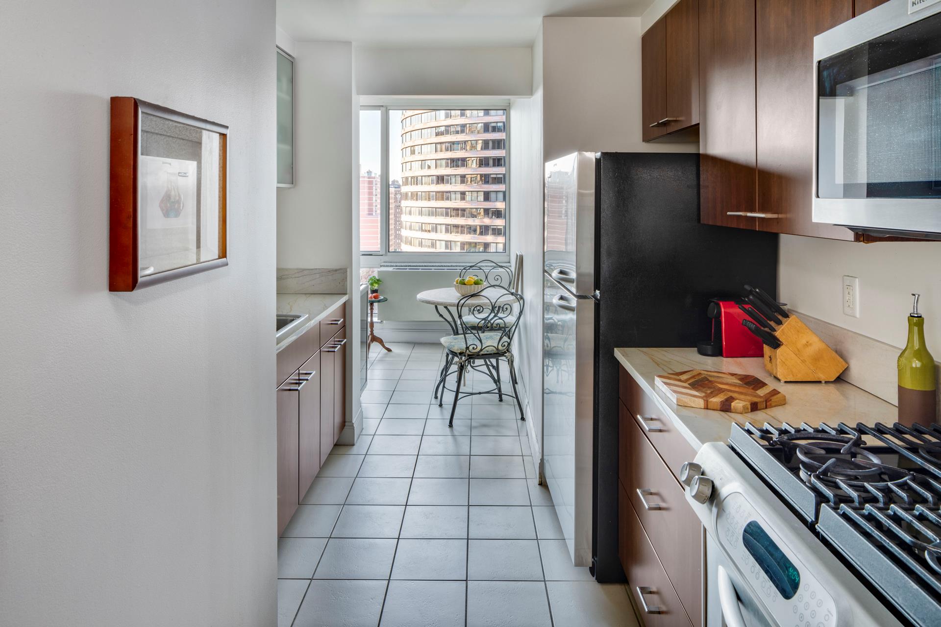 Perched on the 23th floor of One Carnegie Hill, this bright and spacious corner 2BR/2BA boasts tons of light from southwestern exposure. Enter through an ample, elegant foyer and find yourself in a large living room with plenty of space for a full-sized dining table; the sunny, high-end kitchen is fully equipped with top-of-the-line stainless steel appliances and includes a breakfast nook. (Kitchen can be opened up if desired; please consult your architect.) Both bathrooms are completely tiled with marble and offer beautifully appointed vanities and cabinets. The master bedroom has an en-suite bathroom with separate stall shower. Perks include floor-to-ceiling windows with custom remote controlled window treatments throughout and in-unit W/D.