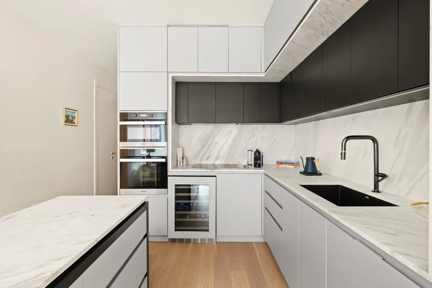 The kitchen is the heart of this home. Custom Italian cabinetry rises ceiling-height in a two-tone finish with a full uninterrupted slab of Italian Volakas marble running from countertop through backsplash in one seamless sweep. A custom island with generous storage anchors the space. Miele and Bosch appliances, an oversized sink with InSinkErator, a wine refrigerator, and a Morris Adjmi-designed anthracite pull-down faucet. This is a kitchen that was genuinely thought through.