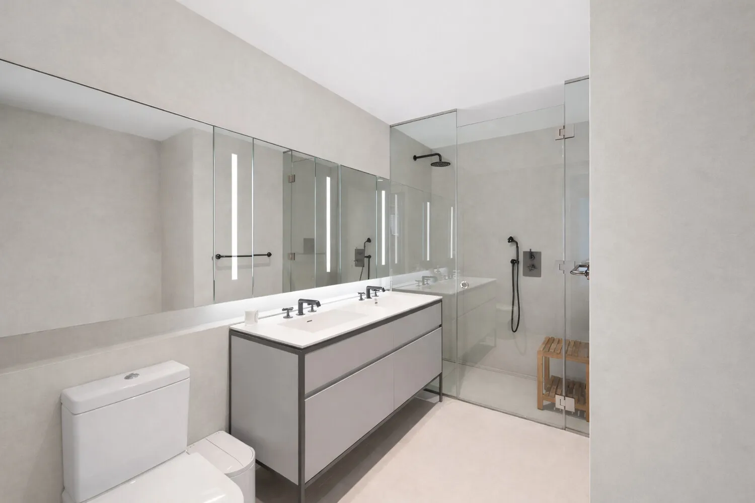 The primary bedroom is generous, serene, and flooded with natural light through floor to ceiling black clad windows. Just outside the bedroom door sits an oversized walk-in closet, fully customized from top to bottom, keeping the bedroom itself clear and calm. Together with the primary bathroom where warm seamless European porcelain wraps floor to ceiling, a double vanity glows with under-mount lighting, and a frameless glass shower with ceiling-mount rain head and custom Morris Adjmi anthracite fixtures awaits, along with a dedicated laundry room with full-size stacked Bosch washer and dryer and additional storage, the entire wing functions as a true private suite. A pocket door closes off the space from the rest of the home when desired. Leave it open and simply close the bedroom door behind you while guests have full run of the living spaces.