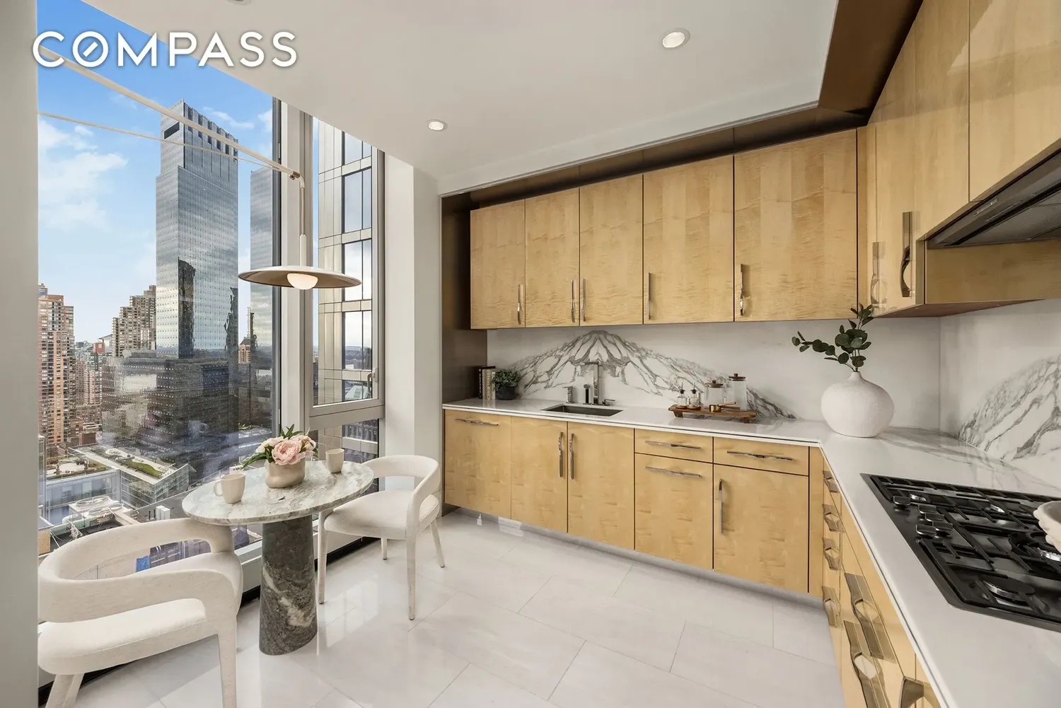 The expansive southwest facing living and dining room is filled with beautiful natural light, creating an elegant setting with Cityscape views. Electric shades, recessed lighting and smart home technology enhance the comfort and ambiance. The luxurious eat-in kitchen, framed by floor-to-ceiling windows, features custom Smallbone cabinetry and premium Miele appliances, offering a bright and beautifully appointed environment for both everyday meals and elevated culinary experiences.