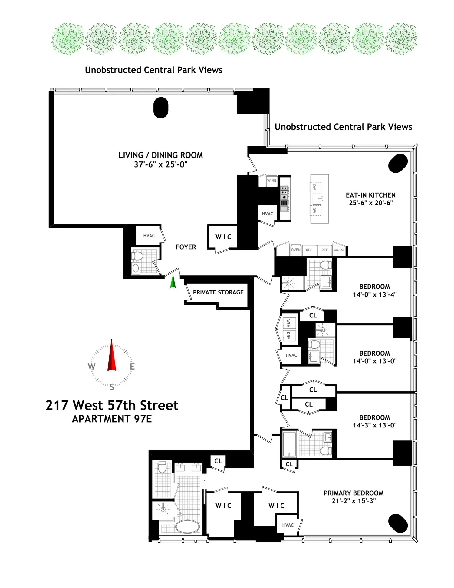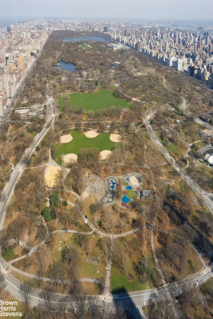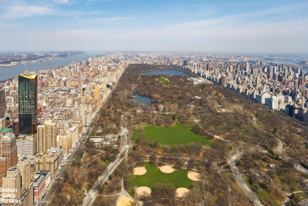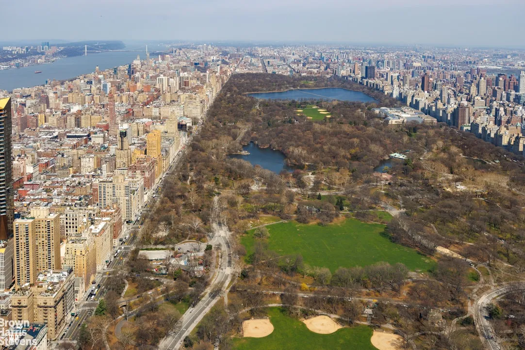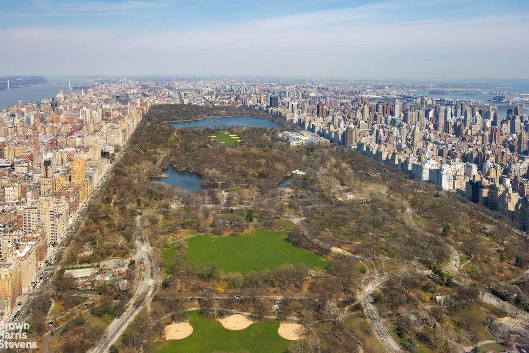 Enter via a formal entry foyer, where you are immediately captivated by the sweeping vistas overlooking Central Park and expanding to both the Hudson and East Rivers. The expansive 37'6" X 25" corner living and dining room is grand and gracious, leaving enough room for three separate living spaces and a large formal dining table. There is also a jewel box powder room off the foyer, and a walk-in coat closet.