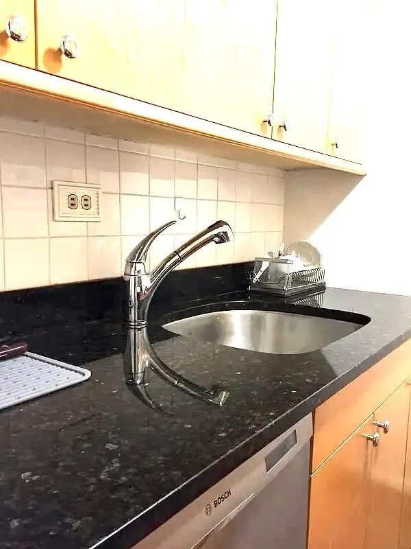 - Renovated kitchen with black granite countertops and custom wood cabinetry