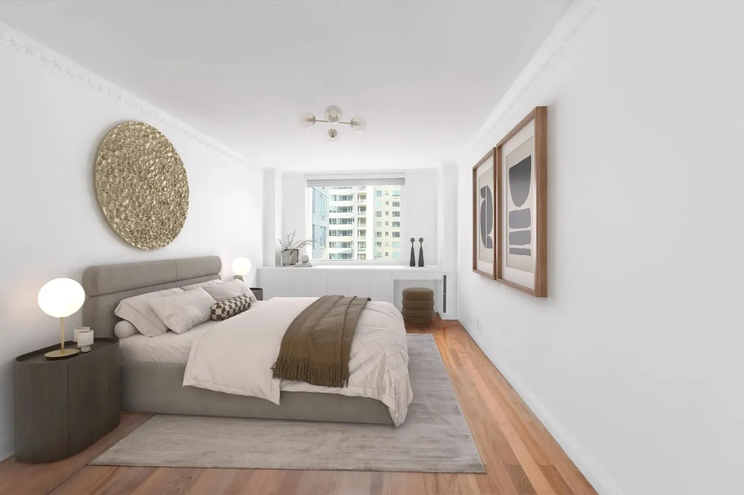 The apartment features a gracious layout with an expansive living and dining area, ideal for entertaining or relaxing at home. Oversized windows bathe the space in natural light and offer open city views. The sleek, modern kitchen is equipped with top-of-the-line stainless steel appliances, granite countertops, and ample cabinetry.