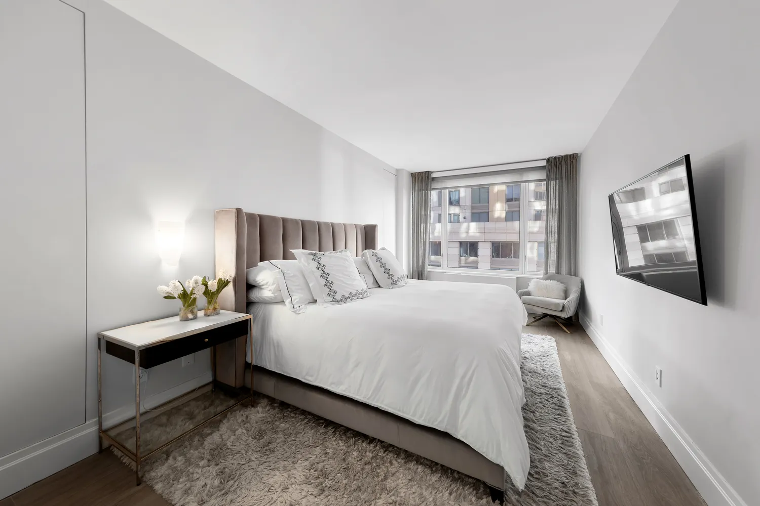 The primary suite is a private retreat, offering two generous walk-in closets along with discreet built-in storage flanking the bed. The spa-like en-suite bath is outfitted by Porcelanosa with Fantini fixtures, dual sinks, recessed Robern medicine cabinets with integrated electrical outlets, a state-of-the-art Toto smart toilet, and a large linen closet with a hamper and abundant storage.
