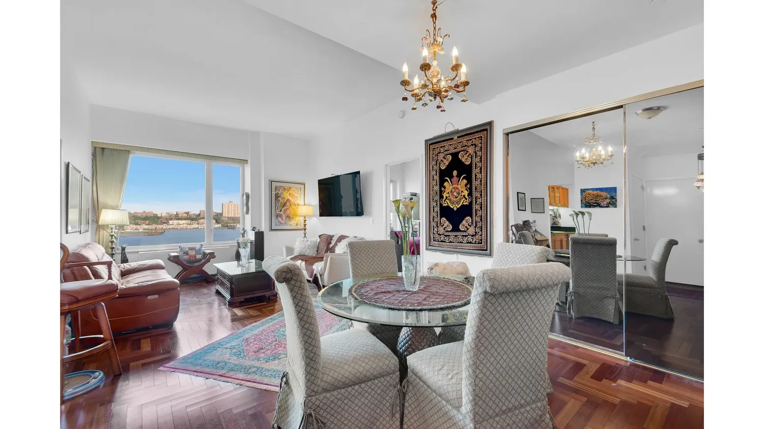 A gracious entry foyer leads into an expansive living and dining area, highlighted by rich hardwood floors and a seamless layout ideal for both everyday living and elegant entertaining. Walls of windows frame sweeping river vistas, creating a serene and elevated atmosphere throughout.