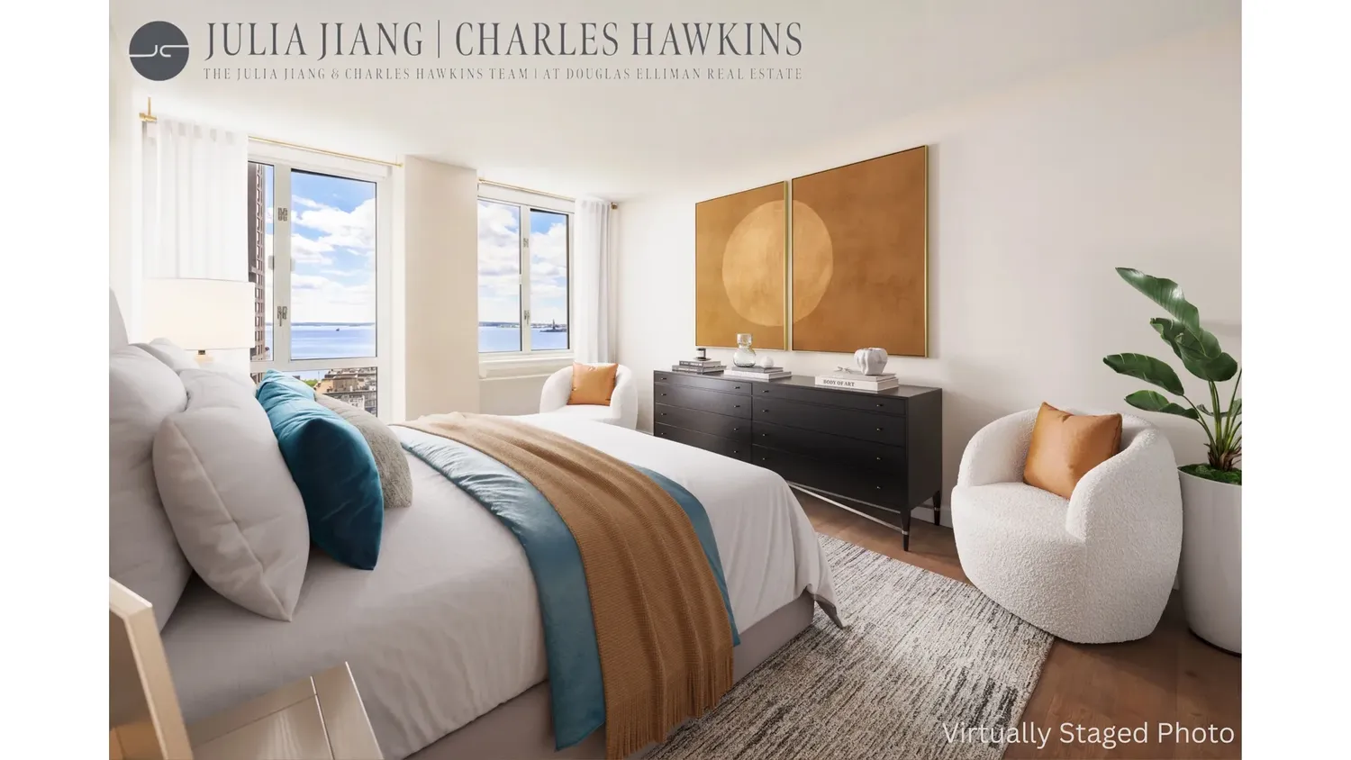 The spacious bedroom continues this tranquil experience, also facing south with stunning views of the Hudson River and the Statue of Liberty. Generously sized, it easily accommodates a king-sized bed along with additional furnishings, making it both comfortable and functional. Large windows invite in soft light and open sky, creating a true retreat within the home.