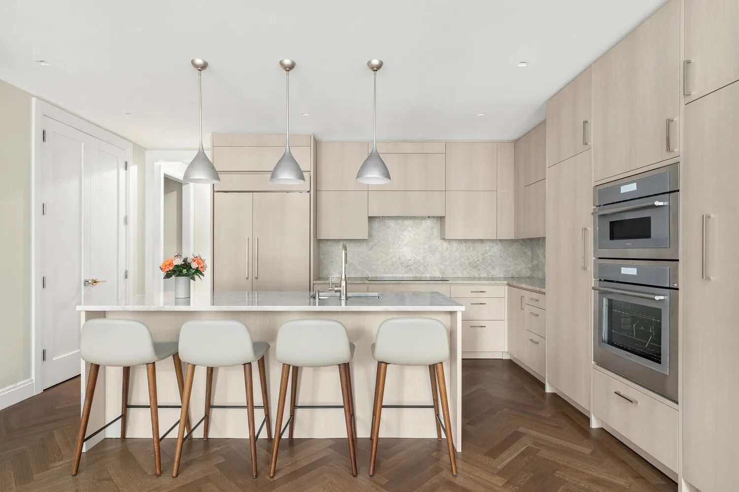 The state-of-the-art open kitchen has been meticulously custom designed, featuring polished Taj Mahal marble countertops and backsplash, bespoke cabinetry, and top-of-the-line Thermador and Sub-Zero appliances. Additional highlights include a convection oven and microwave, a five-burner induction cooktop, an under-counter wine refrigerator, and premium finishes throughout.