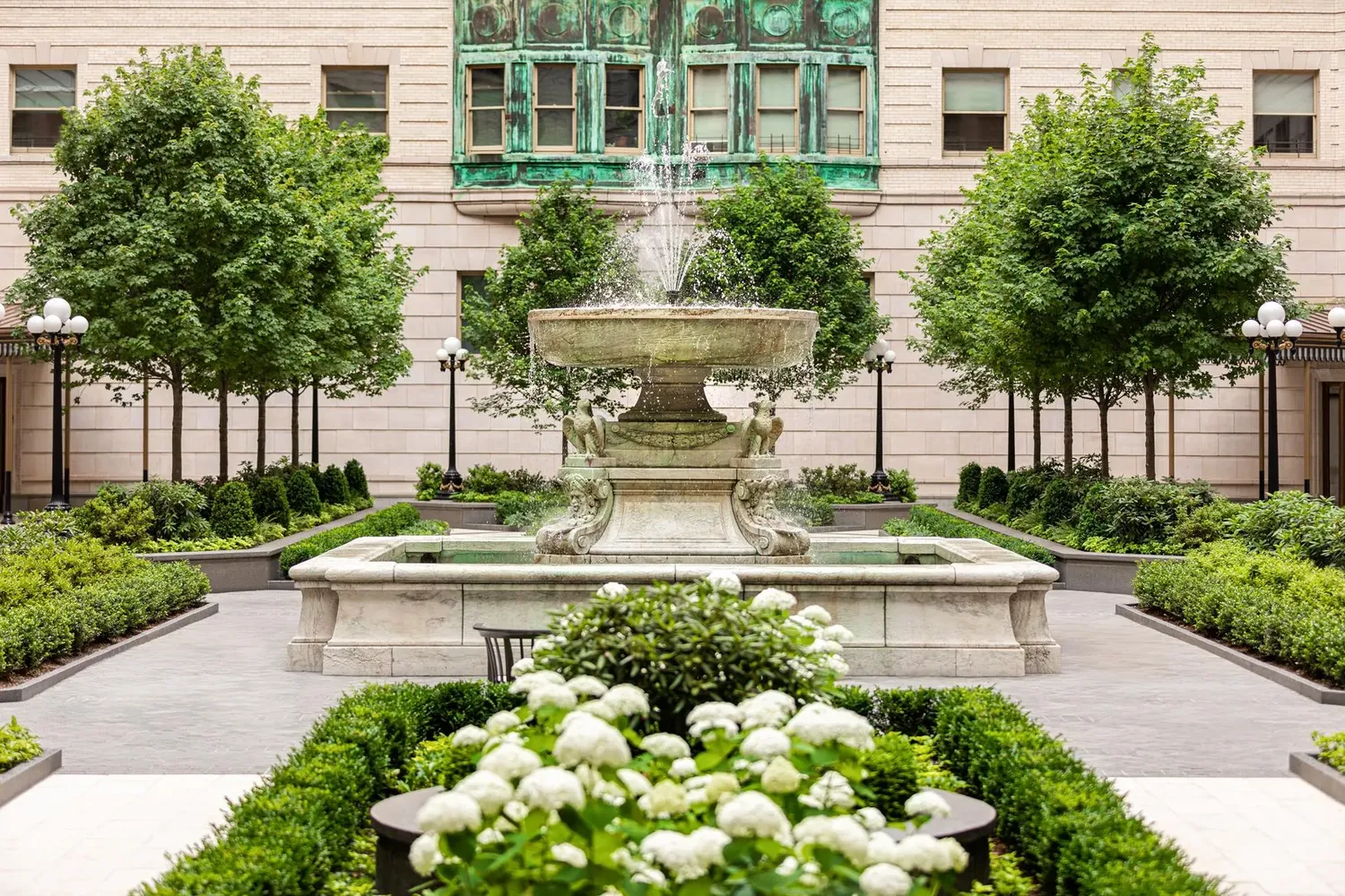 The primary bedroom suite overlooks the serene courtyard and offers a spacious walk-in closet and a spa-inspired en-suite bath appointed with honed marble mosaic floors and beautifully tiled walls extending to wainscoting. The second bedroom, also enjoying courtyard views, features its own en-suite bathroom and generous closet space.