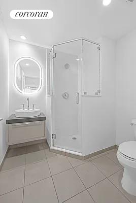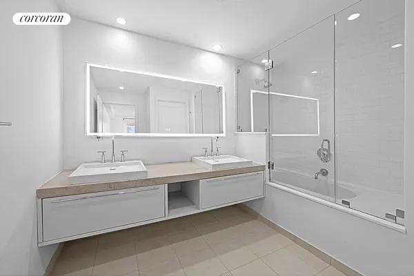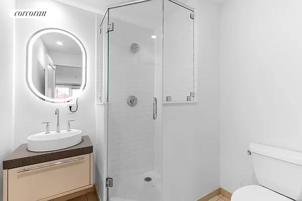 The second bedroom can easily fit a King sized bed and the other full bathroom trades a sunken tub for a stall shower. Throughout the apartment, there is a consistent open feel, from the kitchen to the living room and from the guest room and bathroom alike.