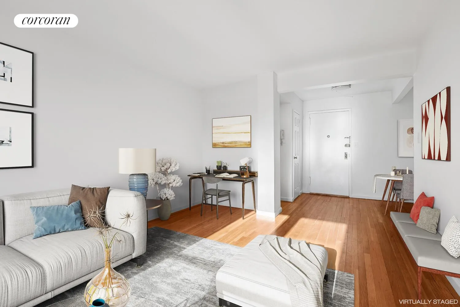 The property features a dining area that seamlessly connects to a galley kitchen, ideal for culinary enthusiasts and entertaining guests. The king-sized bedroom is a true retreat, offering generous proportions and abundant natural light from its sundrenched southern exposure. This inviting space ensures comfort and tranquility, perfect for relaxation after a long day. Additionally, the apartment boasts ample closet space, providing practical storage solutions for all your needs.